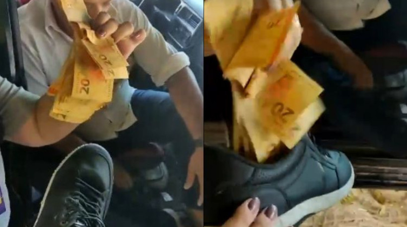 Questionado por que andava com o montante no sapato, o candidato alegou que “anda com dinheiro” no calçado e negou estar cometendo crime eleitoral.