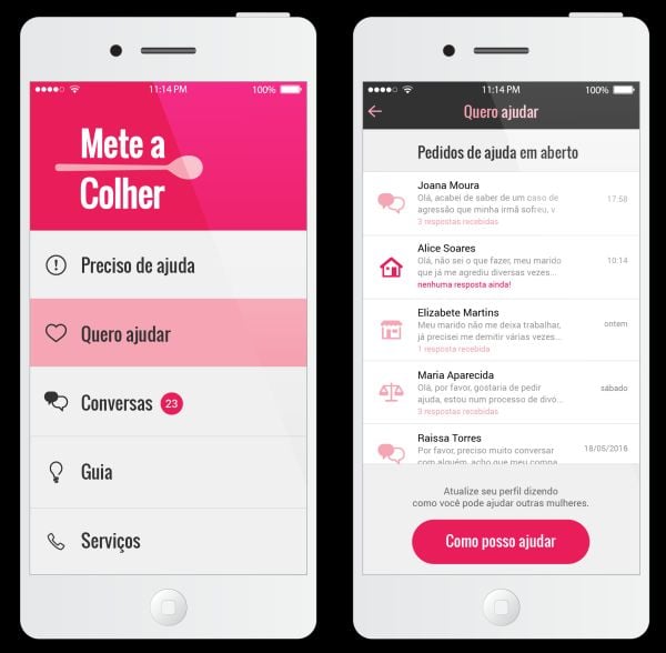 As criadoras do app perceberam que todas as mulheres que enviaram relatos tinham em comum o sentimento de isolamento, e por isso o ''Mete A Colher'' deve seguir a lógica de aplicativos de conversa como WhatsApp e Facebook Messenger.