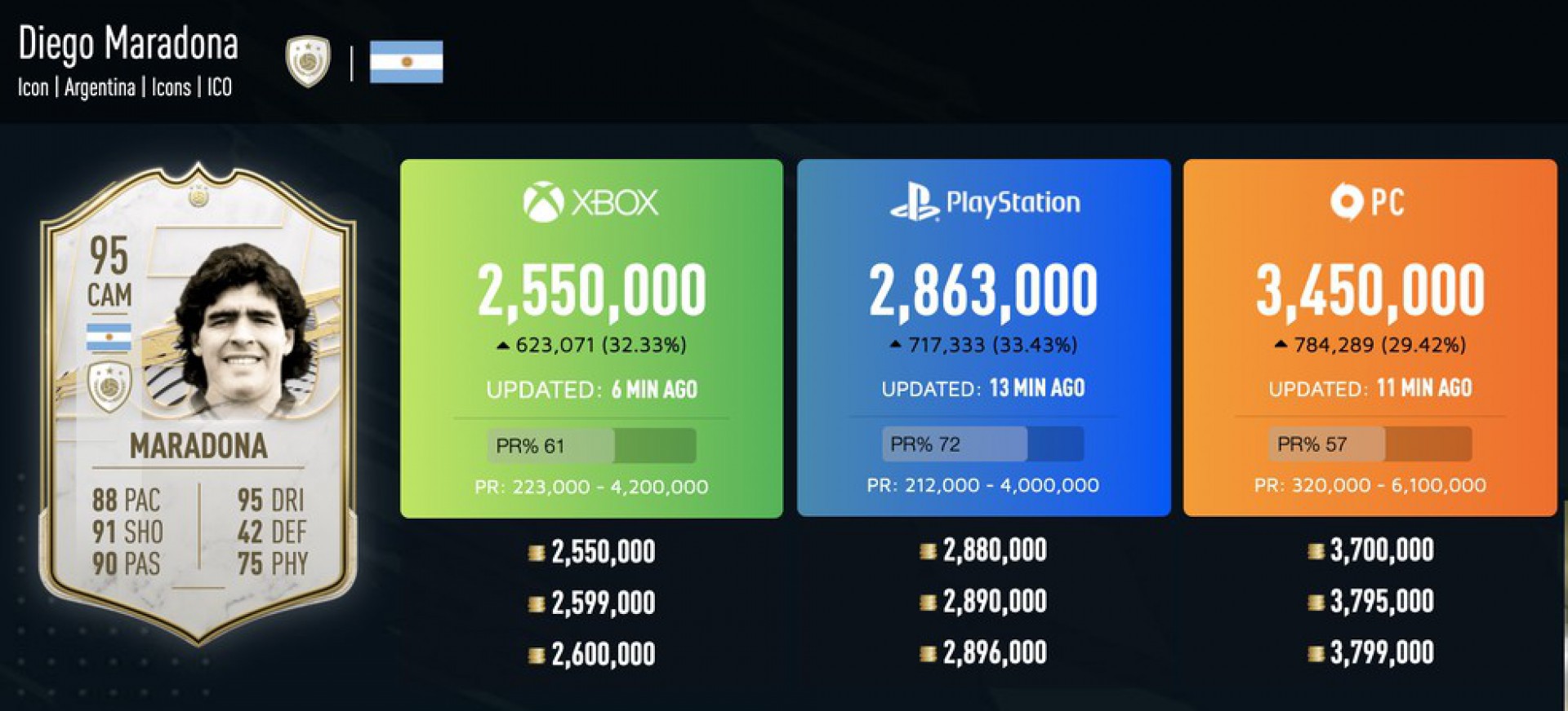 Um dos cards do argentino, o "Mid Maradona", item que representa o auge da carreira do futebolista, com média de 95 pontos (overall), estava sendo vendida por cerca de 2,6 milhões de moedas virtuais. Há dois meses, a mesma carta podia ser encontrada por 2 milhões. O padrão foi semelhante em outras plataformas, como no Xbox e no PC, de acordo com estatísticas do mercado computadas pelo Futwiz. O aumento também pode ser observado na carta com pontuação 91 de Maradona.