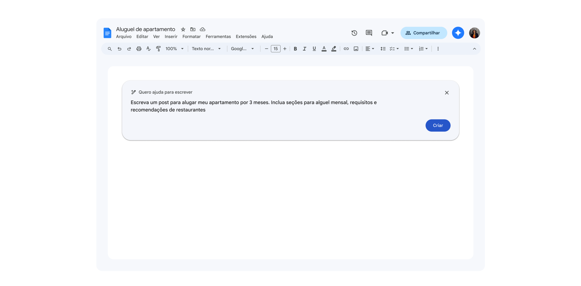 - Após clicar no ícone, basta digitar algumas palavras ou frases que resumam o tema do seu documento e, então, apertar em “Criar”