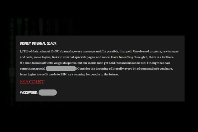 No X (antigo Twitter), um grupo situado na Rússia assumiu a autoria do ataque. O grupo alega ter invadido as conversas do Slack (plataforma de comunicação de equipe) da Disney a partir de um computador comprometido de um funcionário.