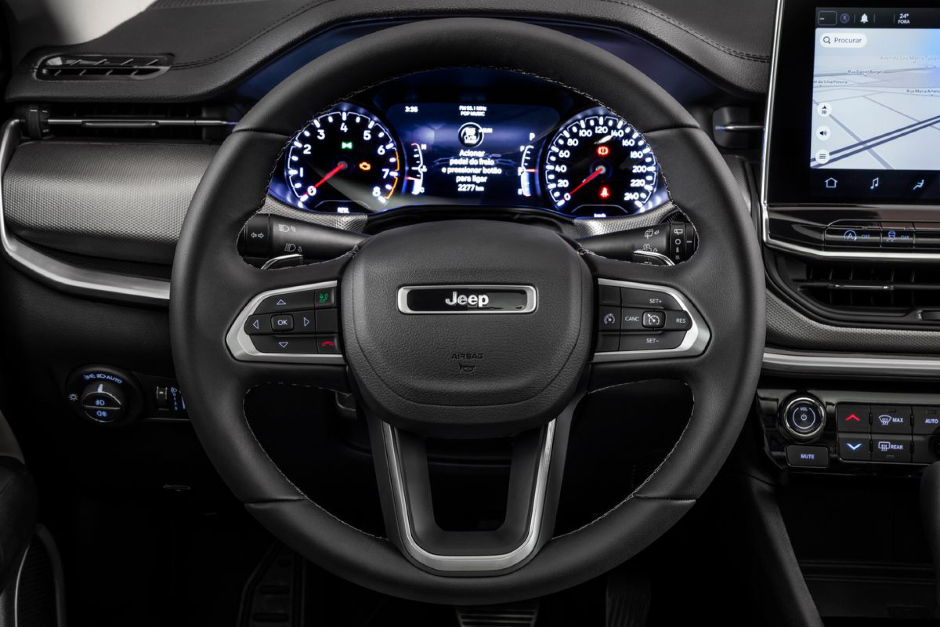 As demais versões do Compass têm multimídia com tela de 8,4 polegadas. Apresenta também itens de condução semiautônoma, entrada USB tipo C, rebatimento automático dos retrovisores, seis airbags de série e porta-malas com sensor de presença – ou seja, abre e fecha a tampa sem o uso das mãos, ao passar o pé debaixo o para-choque traseiro, o que pode ser útil para quem estiver com as mãos carregadas.