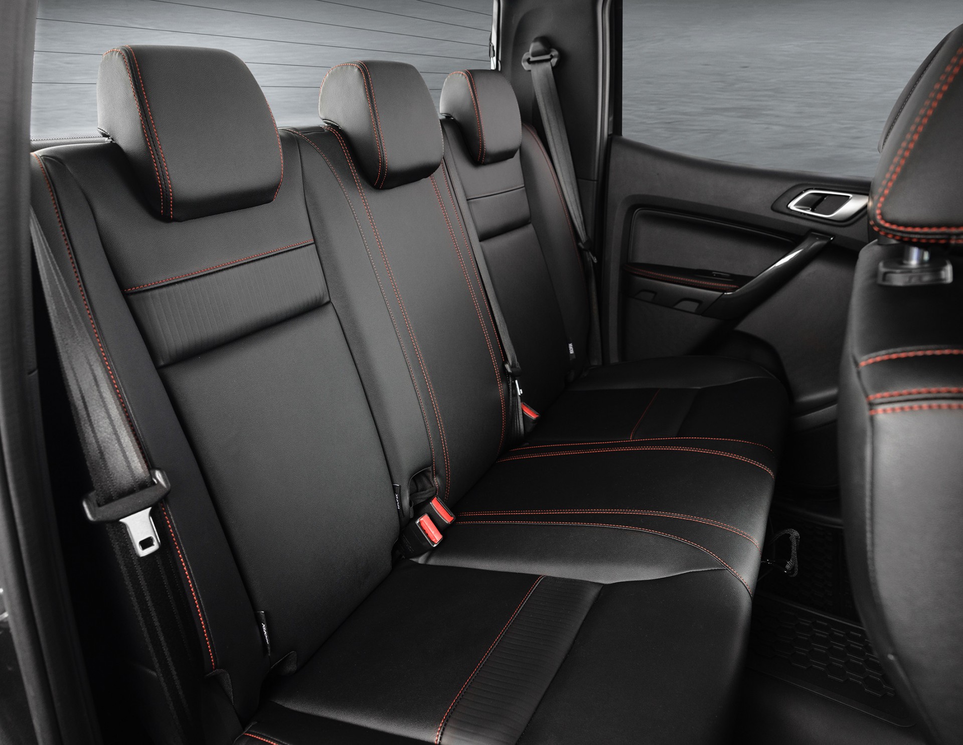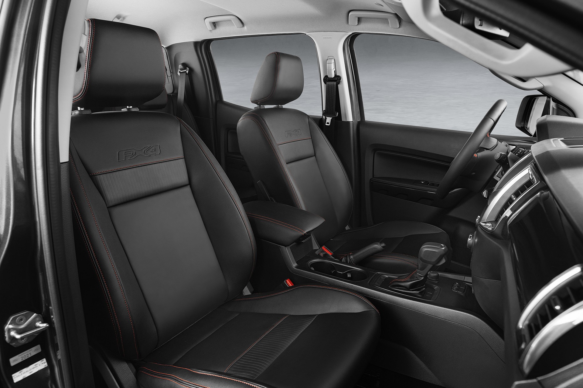 O interior da nova picape inclui bancos de couro premium com costuras vermelhas e o emblema FX4 em relevo nos encostos. O mesmo acabamento é visto na alavanca do câmbio e no descansa-braço central. Outro detalhe é o aplique com acabamento escuro brilhante no painel em frente ao passageiro, no volante e nas molduras das maçanetas internas.
