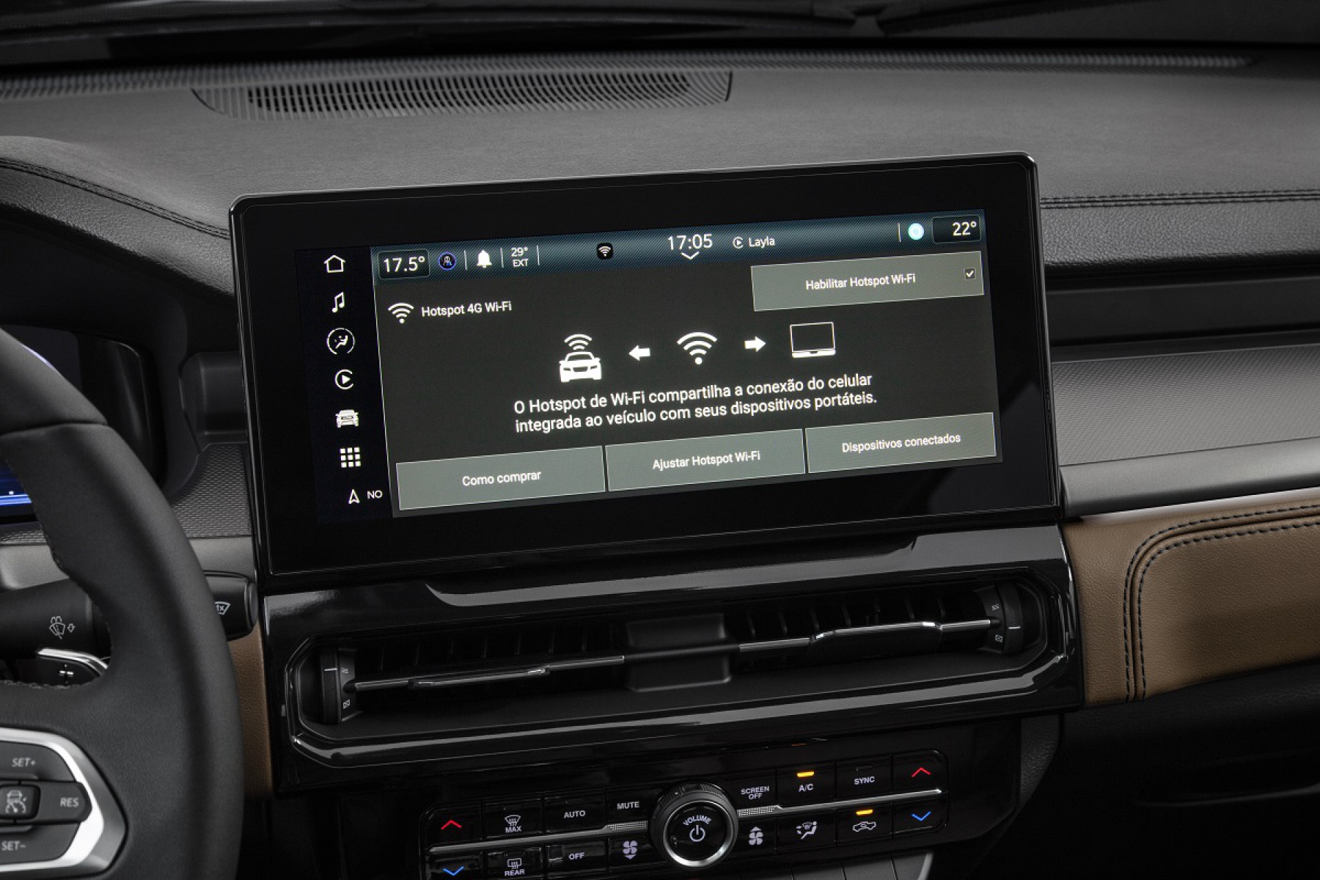 Há conexão sem fio para Apple CarPlay e Android Auto, com chance de parear dois smartphones simultaneamente. O RamCharger também é um facilitador por se tratar de um carregador de celular por indução com saída de ar para resfriar o telefone. São 6 portas USB – sendo 3 do tipo C – distribuídas pela cabine, algo inédito no mercado entre as picapes compactas e médias.