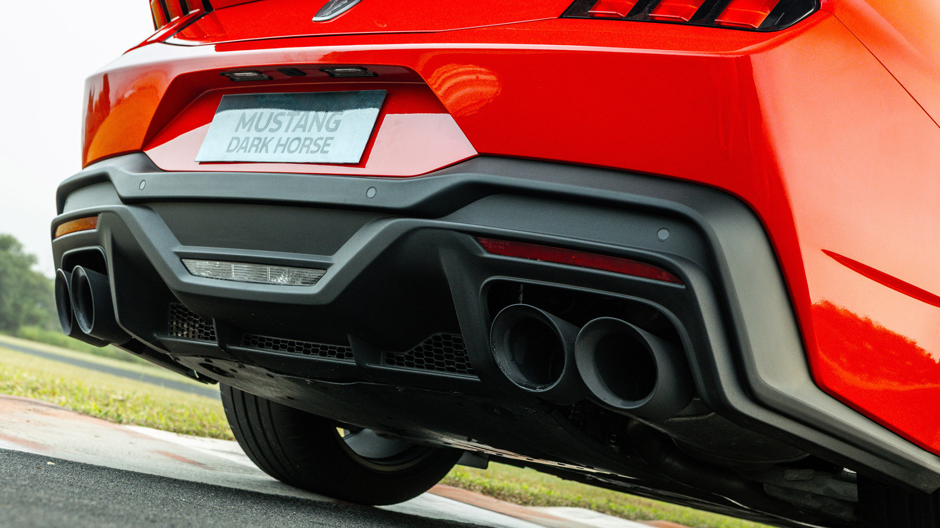 O emblema Dark Horse é aplicado nas laterais, na traseira e nas soleiras. O logo tradicional do cavalo, em versão escurecida, foi mantido na grade dianteira. As pinças de freio pretas exibem os logos Brembo e Mustang.