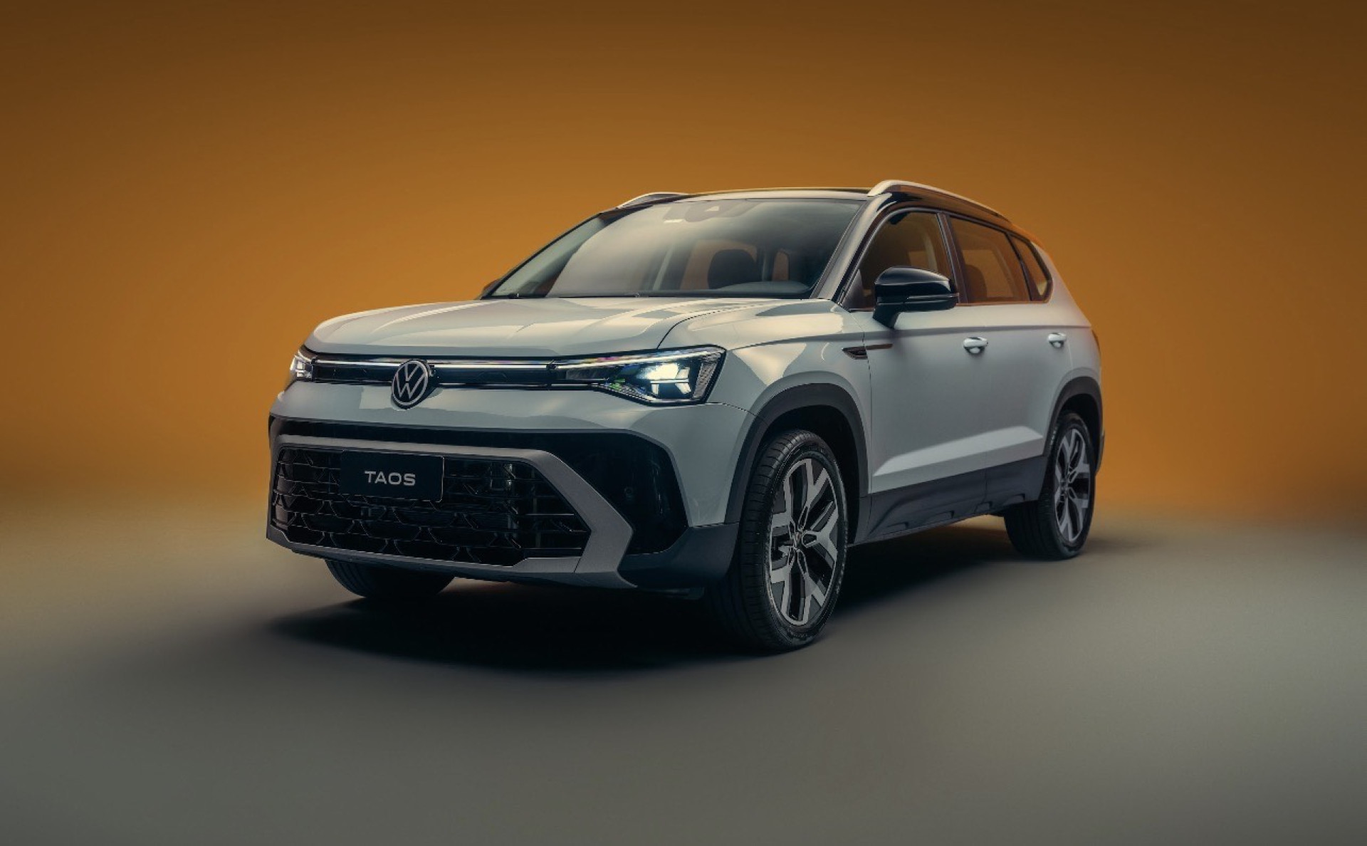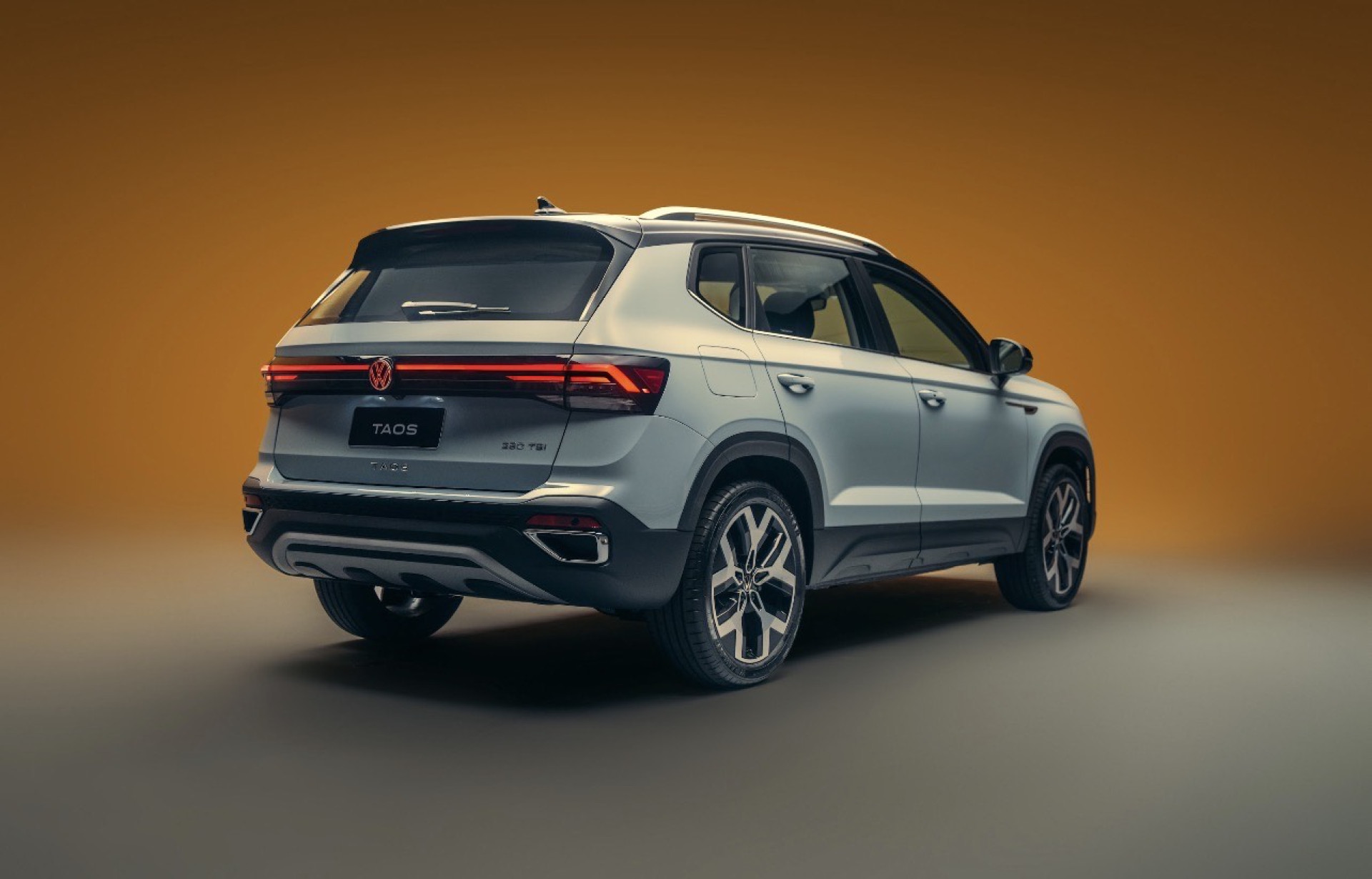 A dianteira do carro foi redesenhada e recebeu novos faróis com correção automática no facho de luz. O canhão principal em LED exibe formato em “X”. Exclusivo para a versão mais cara, o light strip frontal contorna a grade e se integra aos novos para-choques, que ganharam aberturas maiores para entrada de ar, alinhando o Taos ao DNA de design dos SUVs Volkswagen, como Tera, Nivus e TCross. Outro destaque “de cara” é a moldura prateada em plástico fosco sob a grade.
