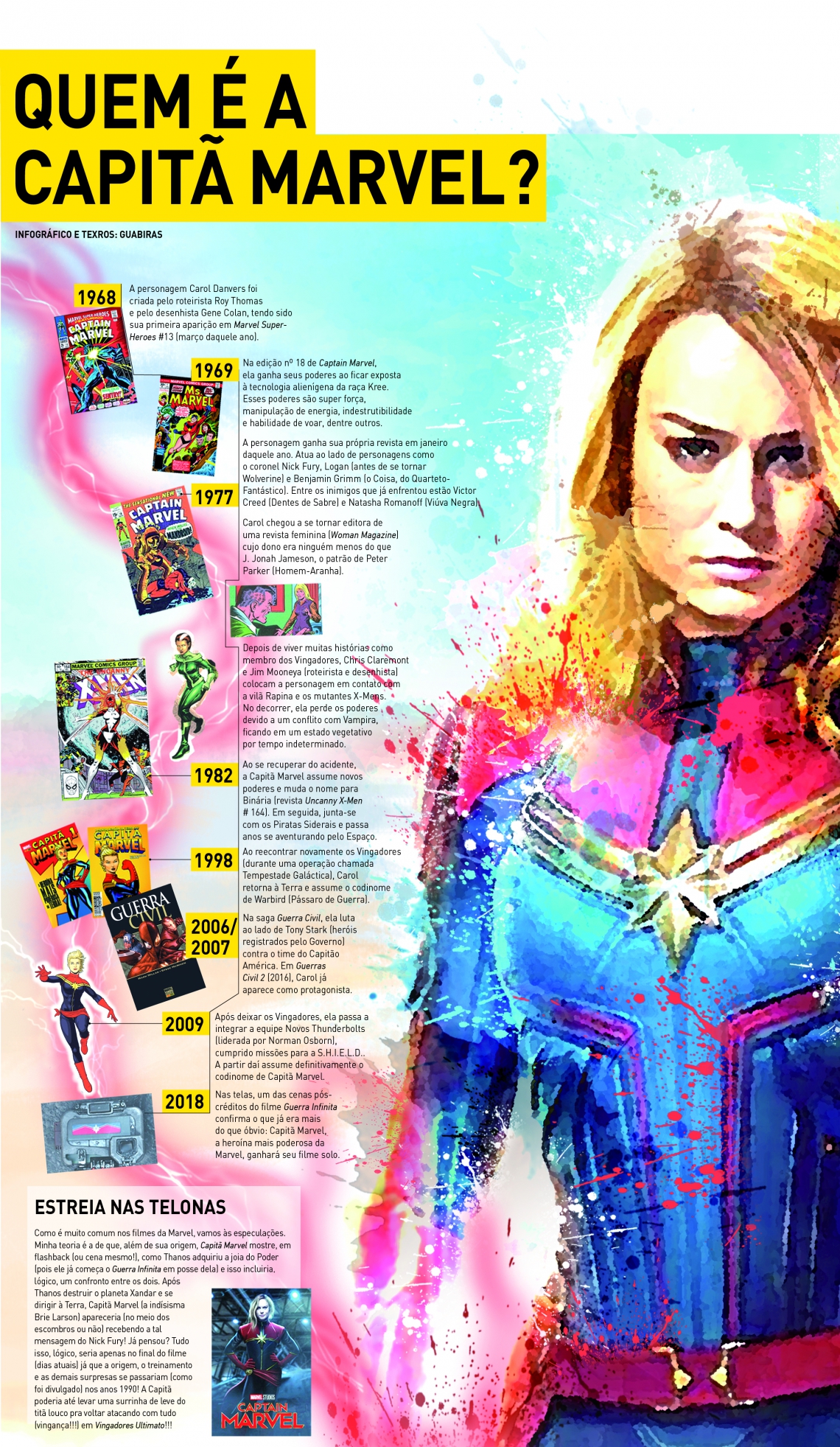 O fime "Capitão Marvel" estreia nesta quinta-feira no Brasil. O cartunista do O POVO, Guabiras, produziu um infográfico para que você entenda melhor a evolução da personagem desde sua primeira aparição nos quadrinhos, em 1968. Confira:Leia também: