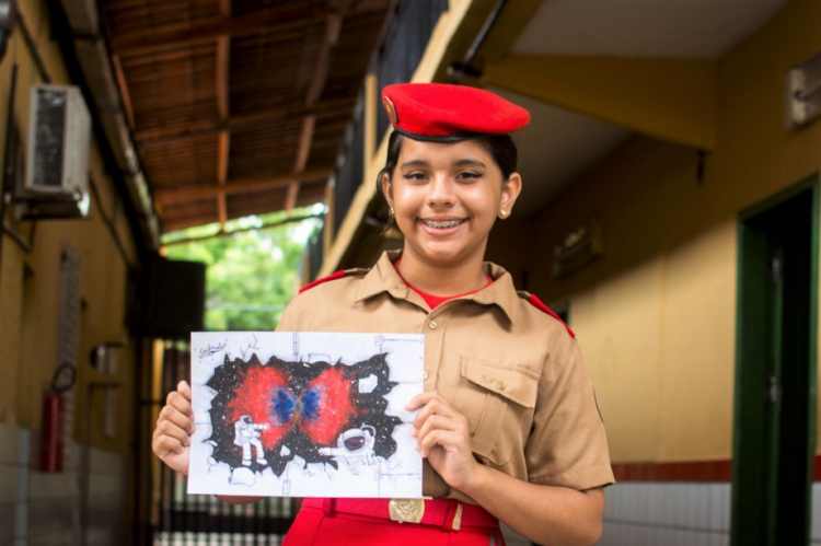 Aluna do 8º ano do Colégio Militar do Corpo de Bombeiros (CMCB), Gabriela Campos Feitosa inspirou-se na Nebulosa da Borboleta para realizar seu desenho. Uma das estruturas nebulosas mais complexas já observadas pelo olho humano chamou a atenção para que a estudante realizasse o trabalho. “Eu pensei nessa nebulosa por ser diferente. Era uma estrela que se dividiu e se transformou nessa nebulosa com formato de borboleta”, conta.