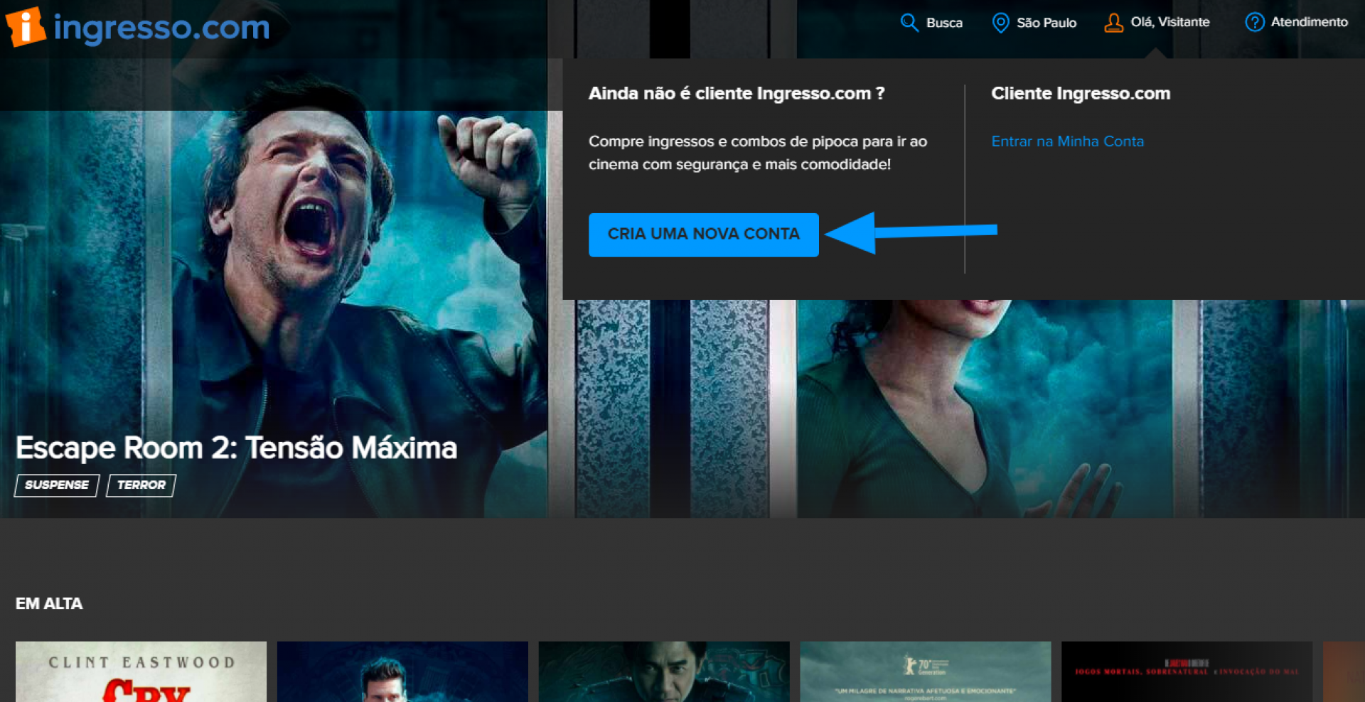 2. Onde pede para informar login e senha, clique no campo "Criar uma nova conta" na seção "Não é cliente Ingresso.com?"