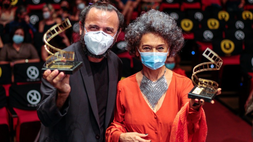 O cineasta cearense Halder Gomes ("Cine Holliúdy", "Cine Holliúdy 2: A Chibata Sideral"; "O Shaolin do Sertão") e a cantora, compositora, atriz e jornalista Marta Aurélia foram homenageados na abertura do 31º Cine Ceará - Festival Ibero-americano de Cinema na noite deste sábado, 27. Celebrados pelas contribuições artísticas ao Estado, os premiados receberam o Troféu Eusélio Oliveira das mãos do secretário da Cultura do Ceará Fabiano Piúba no Cineteatro São Luiz. Até a próxima sexta-feira, 3 de dezembro, o Cine Ceará acontece em formato híbrido, presencial em Fortaleza e on-line no Canal Brasil, Canais Globo, Globoplay + Canais ao Vivo, no Youtube do evento e na TV Ceará.