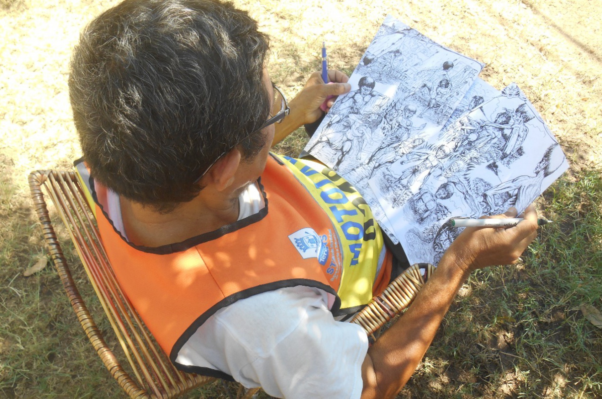 Assim, enquanto espera a chamada de seus passageiros, ele exerce seu talento e sua criatividade nos quadrinhos e dá, a partir de seus traços, a visão de histórias que imagina. Antes com pincel, agora usa uma “caneta técnica” para seus desenhos - e as pessoas que passam pela praça não escondem a admiração pelo trabalho do artista. “Eu tenho uma cadeira na praça, aí coloco a prancheta e o papel na perna e fico desenhando quando não tem cliente. O pessoal fica olhando e admirando”, garante.