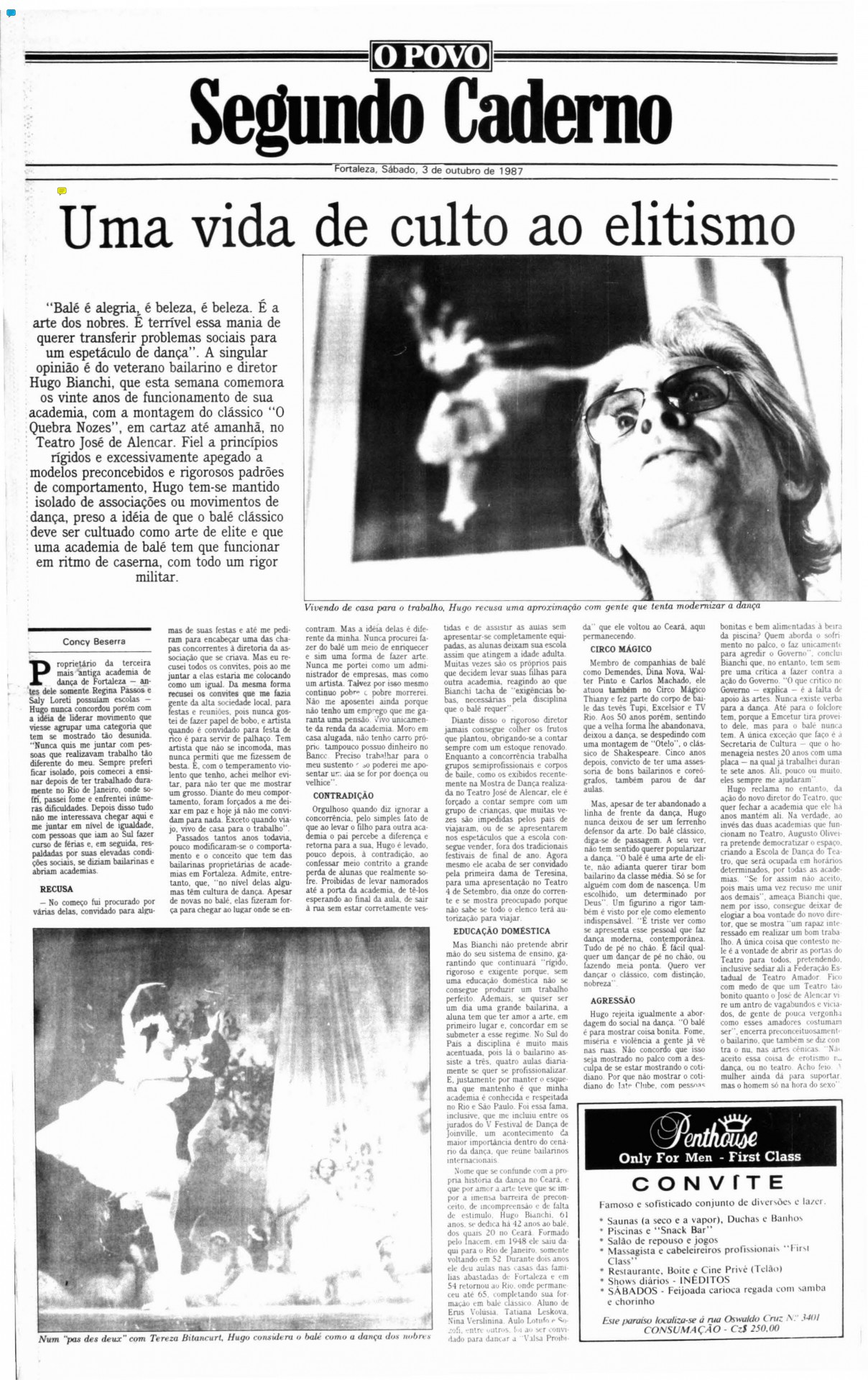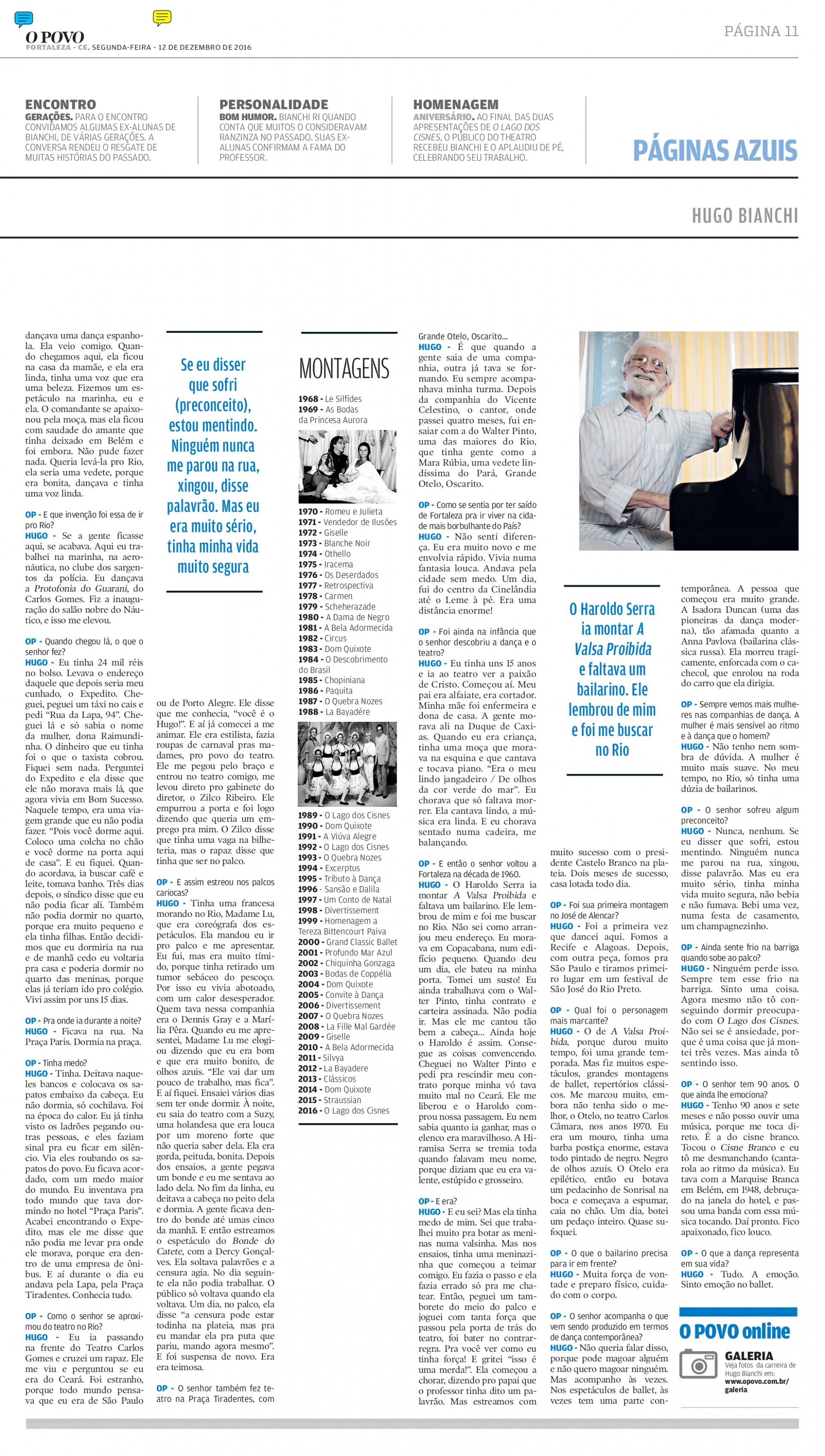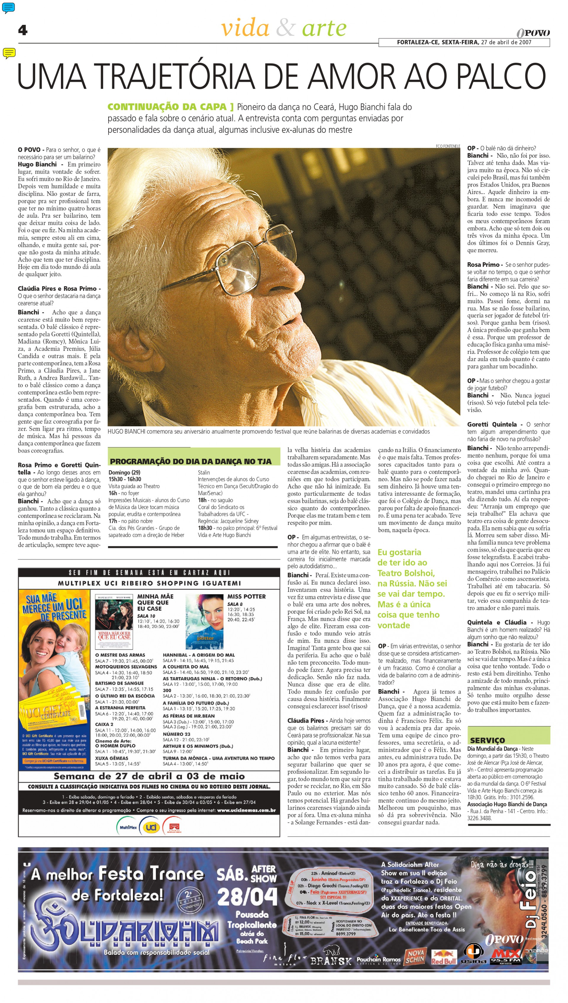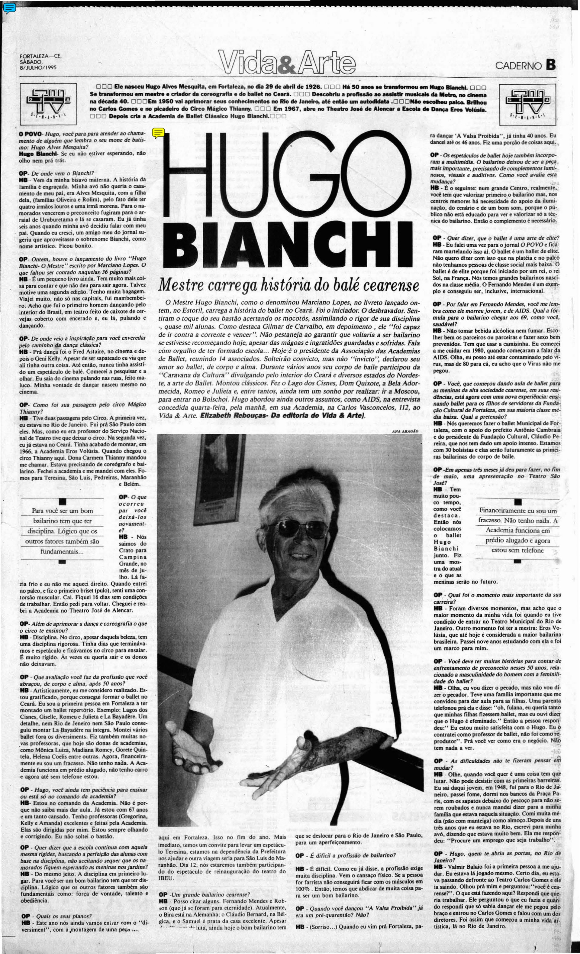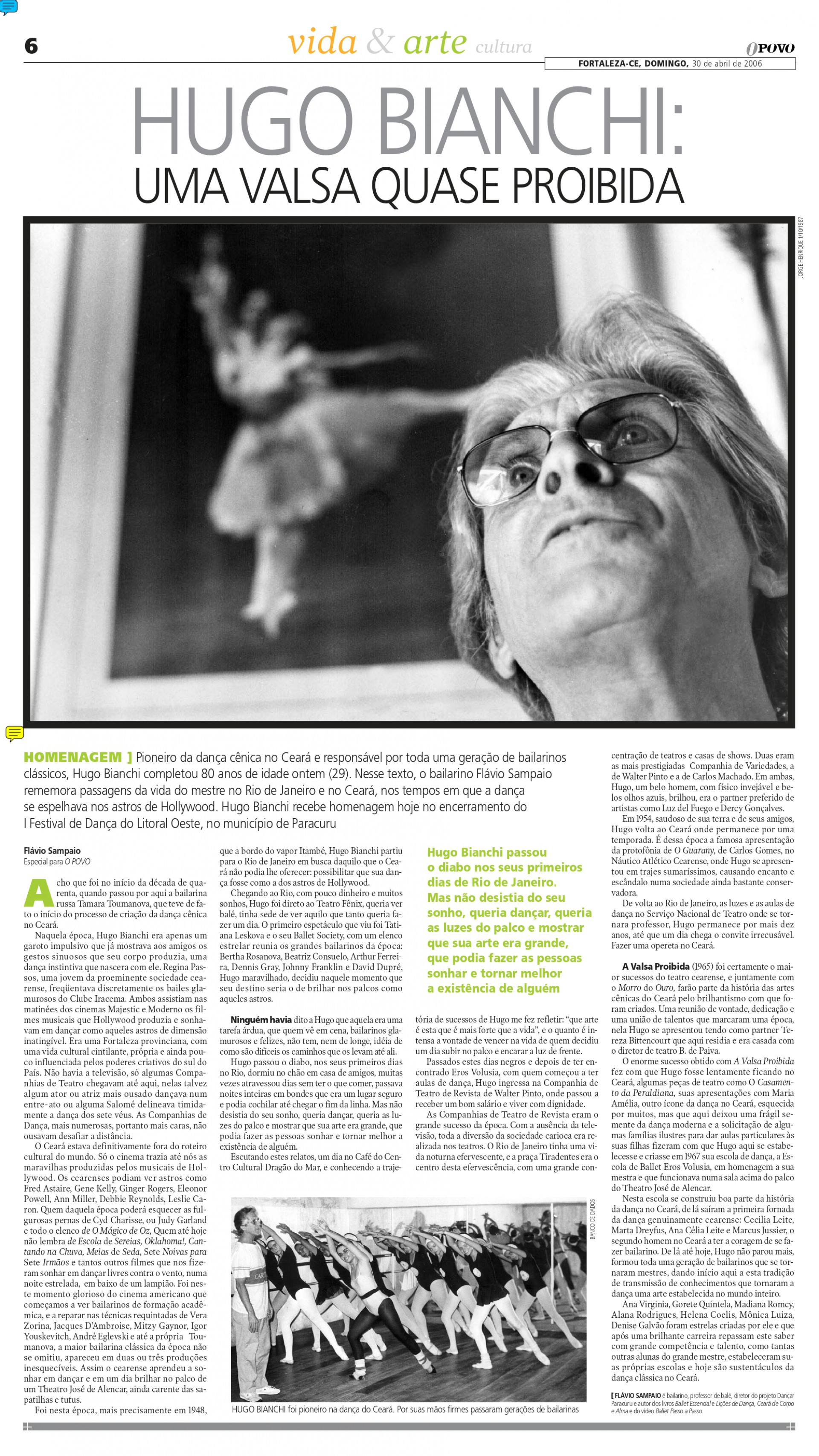 Hugo Bianchi (1926 - 2022) sempre dispensou eufemismos ao falar do trabalho de um bailarino. “Em primeiro lugar, precisa de muita vontade de sofrer”, disse em entrevista ao O POVO, em abril de 2007. Para ele, não há tempo para “farras”, porque o profissional deve focar no alto rendimento de seu corpo. Força de vontade, talento e obediência também são essenciais. Entretanto, o mais indispensável no meio de um mercado em que “hoje em dia todo mundo dá aula de qualquer jeito” é a disciplina. Por causa disso, alguns até podiam considerá-lo grosseiro (não se importava de dividir opiniões), mas foi seu zelo pela conduta que lhe levou a ser um dos pioneiros do balé no Ceará e a viabilizar um mercado para a dança no Estado.