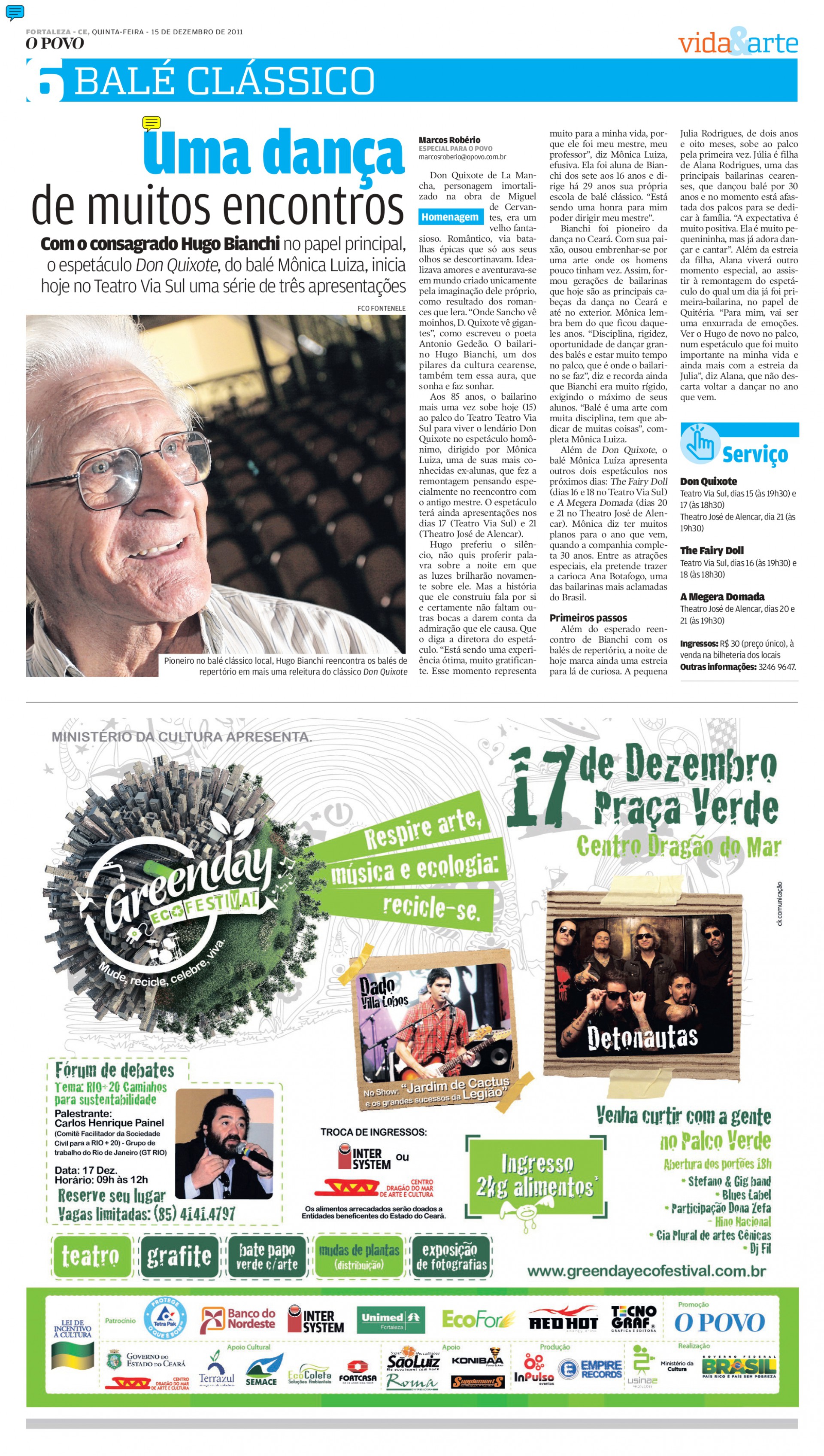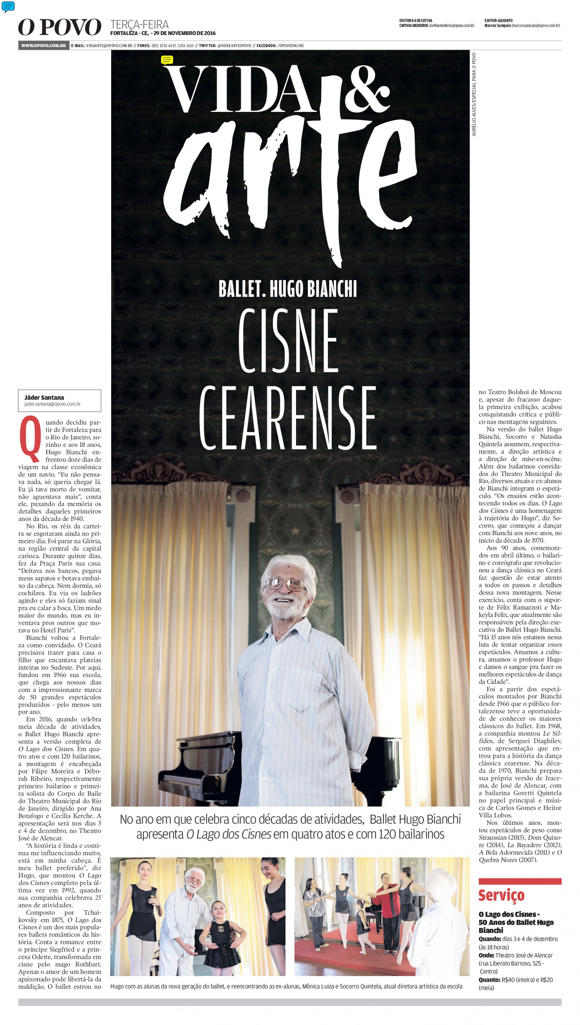 A Associação das Academias de Dança do Ceará, que tem dezenas de estabelecimentos filiados, é a organizadora. “A gente só morre quando é esquecido. Vamos homenageá-lo. Haverá um espetáculo para as melhores apresentações do ano. As escolas associadas vão ser homenageadas e terão esse selo ‘Hugo Bianchi’ de excelência”, explica Felix, que também é presidente da associação.
