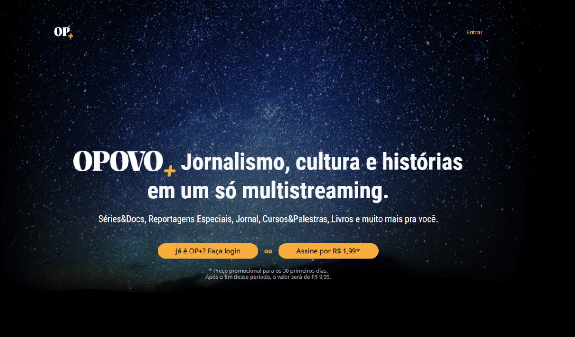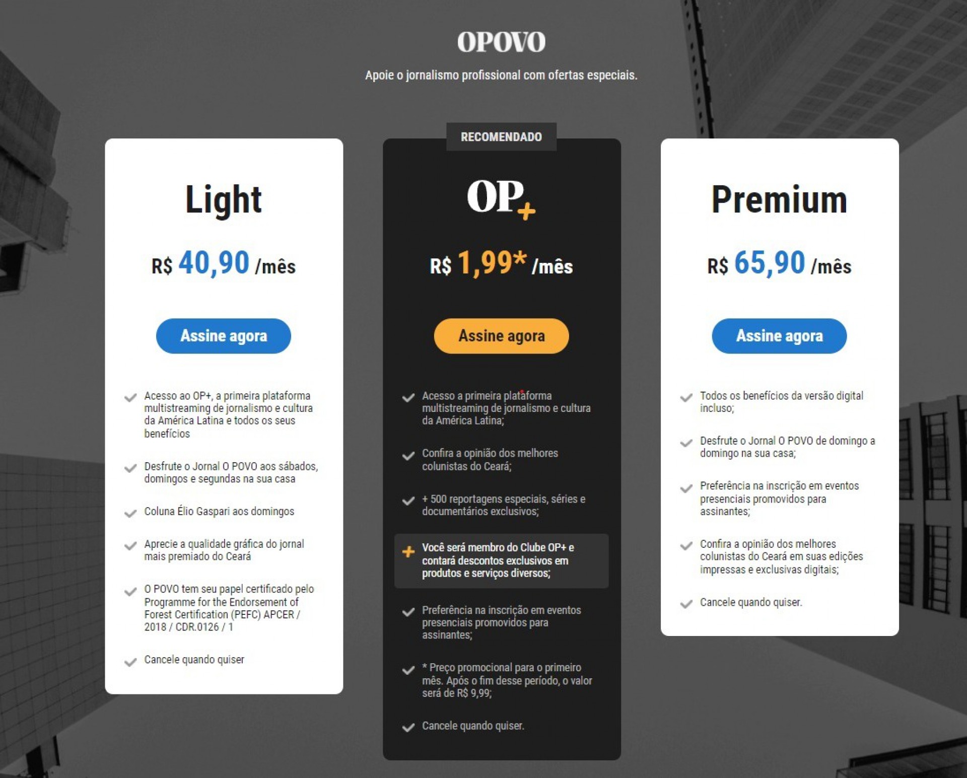 - Plano OP+ (R$1,99/mês*): nesse plano, o assinante tem acesso ao OP+, a primeira plataforma multistreaming de jornalismo e cultura da América Latina, opinião de diversos colunistas cearenses e nacionais, mais de 500 reportagens especiais, séries e documentários exclusivos e preferência na inscrição em eventos presenciais para assinantes; além disso, o assinante desse plano se torna membro do “Clube OP+”, com descontos exclusivos em produtos e serviços diversos. *O preço de “R$1,99” é promocional para o primeiro mês; depois do fim desse período, o valor se torna R$ 9,99 mensais