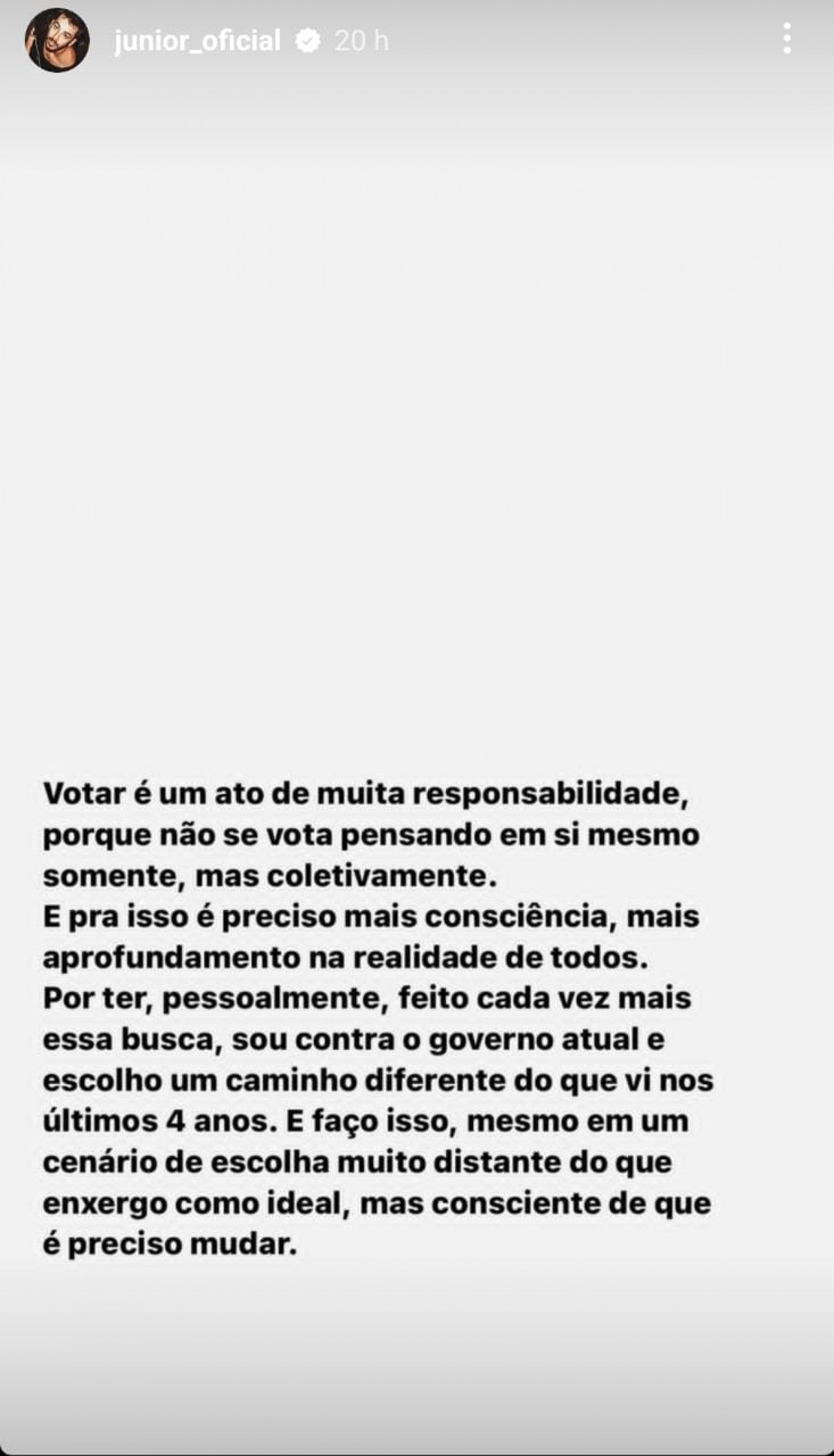 "Votar é um ato de muita responsabilidade, porque não se vota pensando em si mesmo somente, mas coletivamente. E, para isso, é preciso mais consciência, mais aprofundamento na realidade de todos. Por ter, pessoalmente, feito cada vez mais essa busca, sou contra o governo atual e escolho um caminho diferente do que vi nos últimos quatro anos. Faço isso mesmo em um cenário de escolha muito distante do que enxergo como ideal, mas consciente de que é preciso mudar", argumentou.