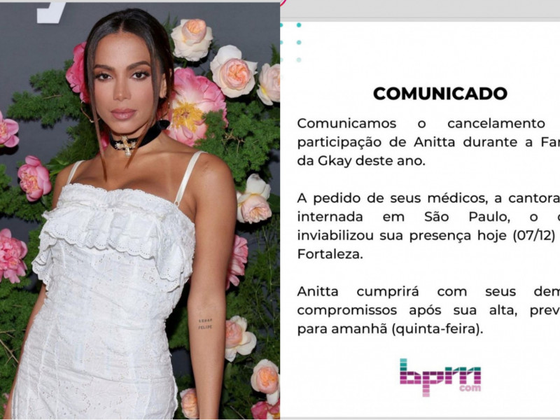 "Comunicamos o cancelamento da participação de Anitta durante a Farofa da Gkay deste ano. A pedido de seus médicos, a cantora foi internada em São Paulo, o que inviabilizou sua presença hoje (7/12) em Fortaleza. Anitta cumprirá com seus demais compromissos após sua alta, prevista para amanhã (quinta-feira)", informou a assessoria.
