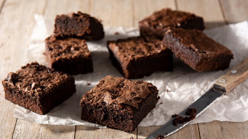 Em um liquidificador, coloque todos os ingredientes, exceto o chocolate derretido e as nozes, e bata até obter uma consistência homogênea. Em um recipiente, coloque a massa e adicione o chocolate e as nozes, mexa para incorporar. Unte uma assadeira com óleo de coco e disponha a massa sobre ela, leve ao forno preaquecido a 180°C por 20 minutos. Sirva em seguida.