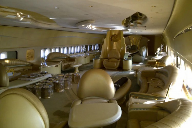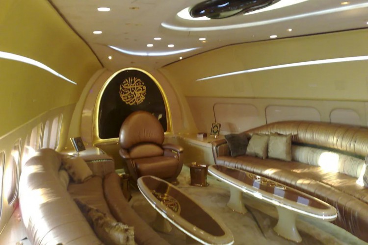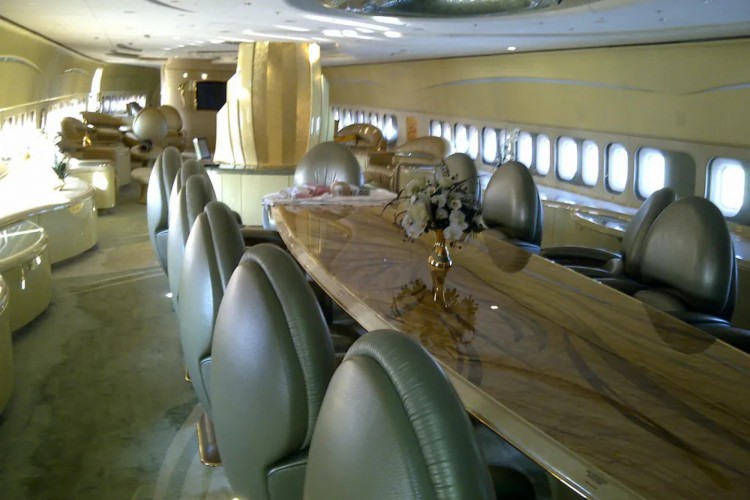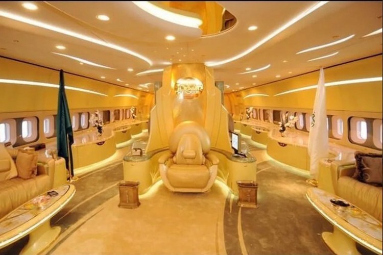 O Boeing 747 possui dois andares e uma cadeira semelhante a um trono no centro da sala de estar, onde o príncipe se reúne com ministros e assessores.