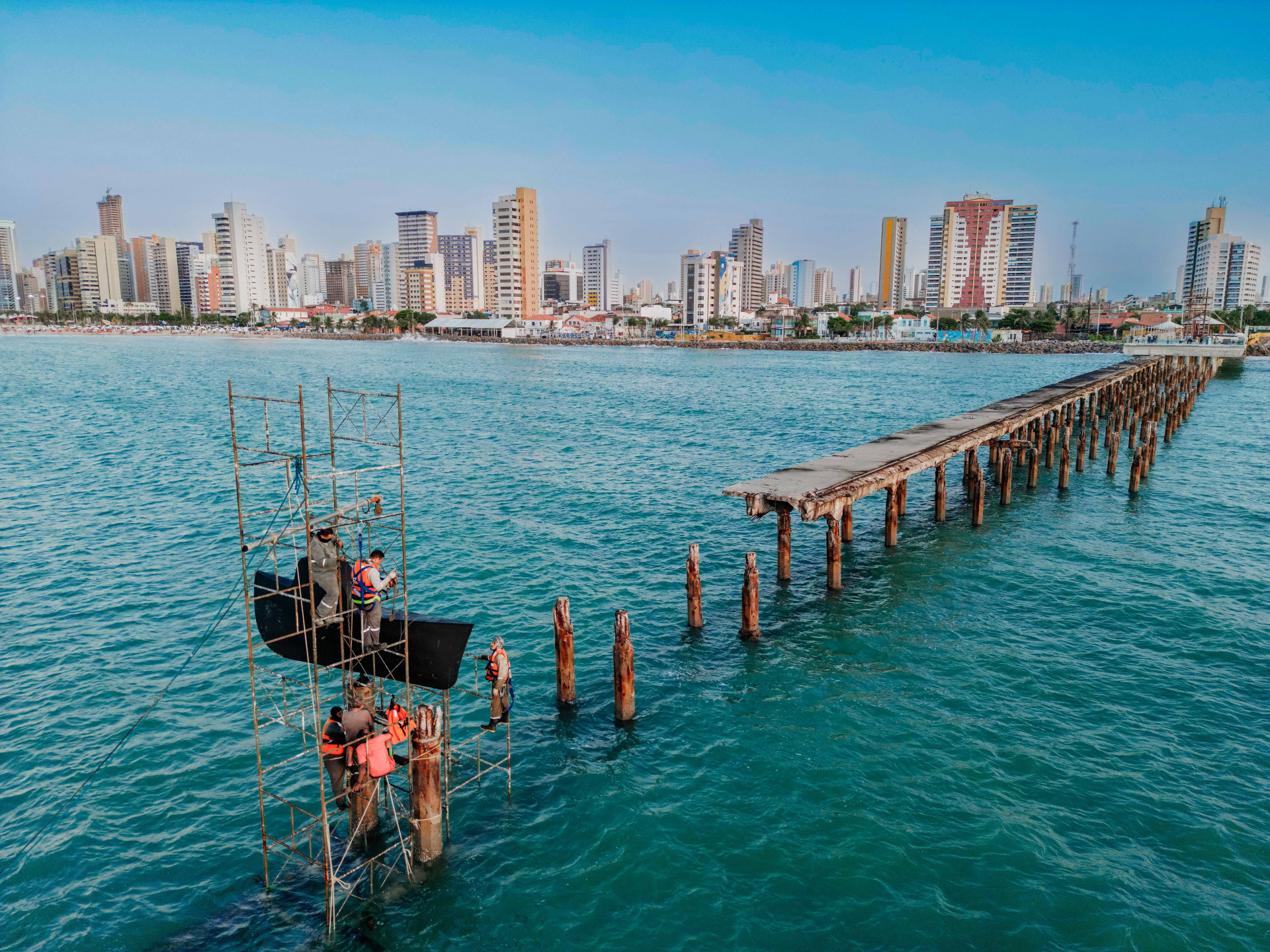 A escultura Le Femme Bateau está sendo recolocada na Ponte dos Ingleses, na Praia de Iracema, na tarde desta segunda-feira, 24.