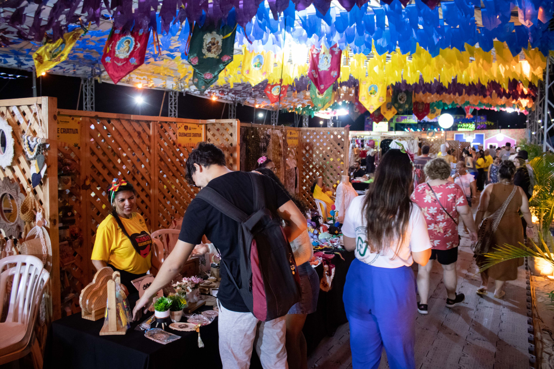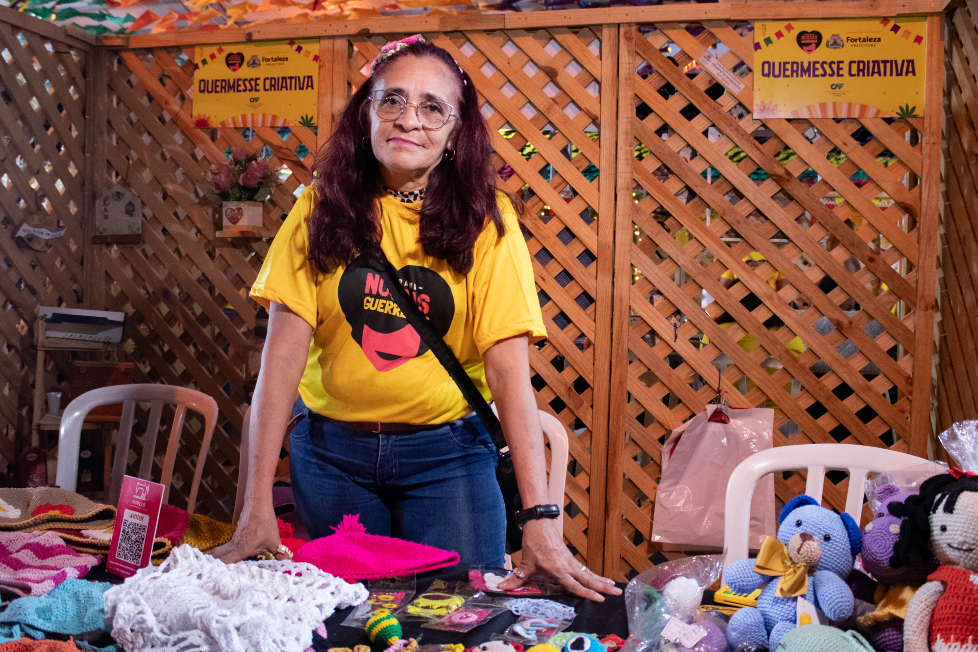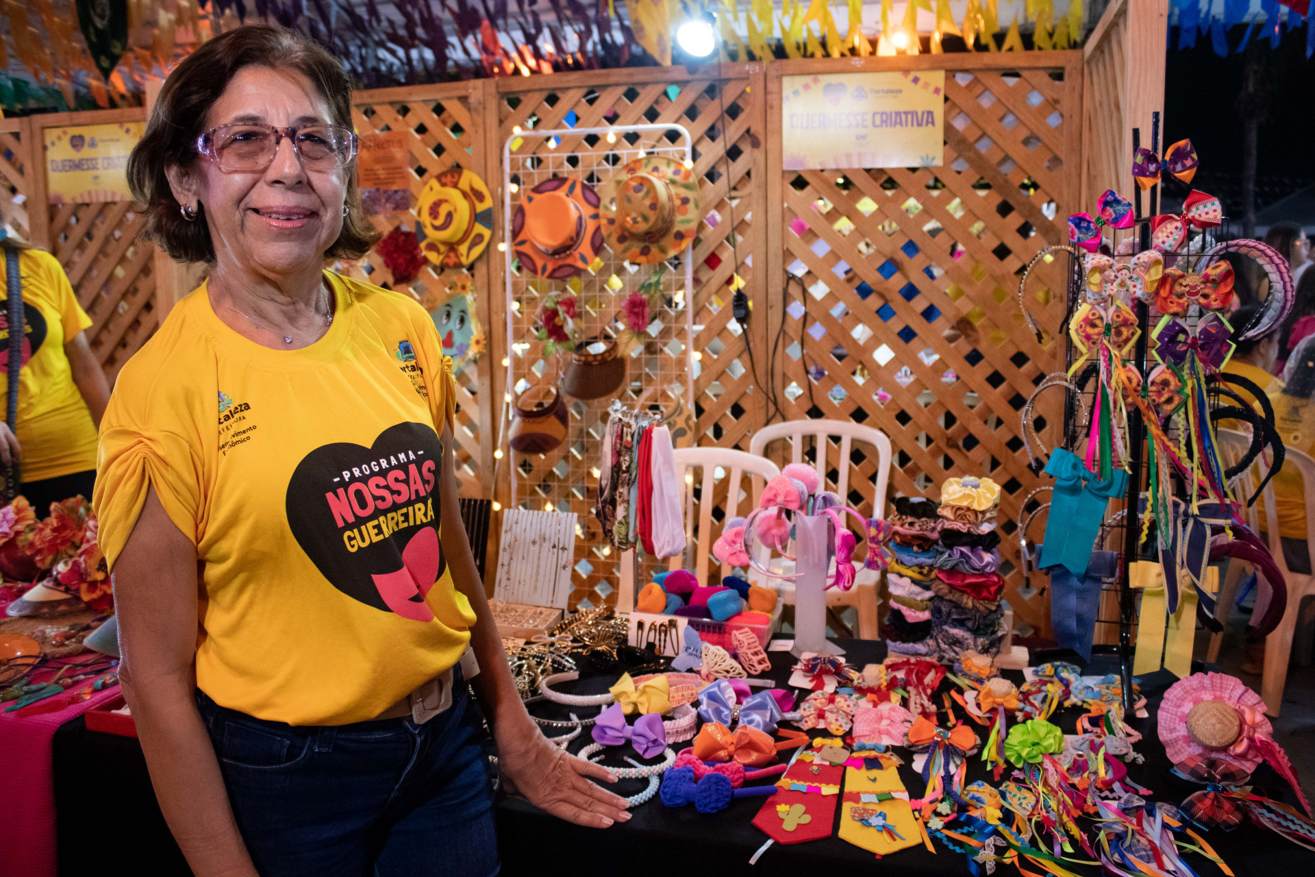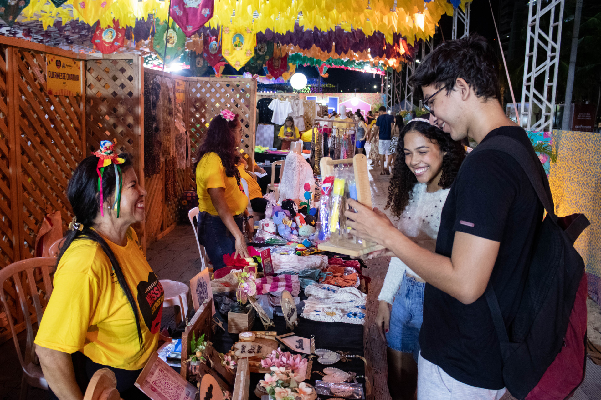 Uma das novidades no evento deste ano foi a Feira Quermesse Criativa, ação organizada pela Secretaria de Desenvolvimento Econômico (SDE), estabelecida na faixa de areia. Maria de Fatima vende crochê há 30 anos, ofício que é como uma herança de família, e conta que durante os três dias de festas suas vendas ocorreram muito bem.