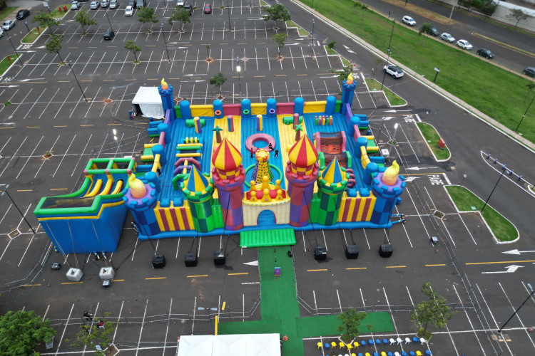 Instalado no estacionamento do Shopping Riomar Kennedy, o brinquedo inflável possui 2.500 m² de área, contando com escorregadores gigantes, pula-pulas, estruturas de escalada e pistas de obstáculos.