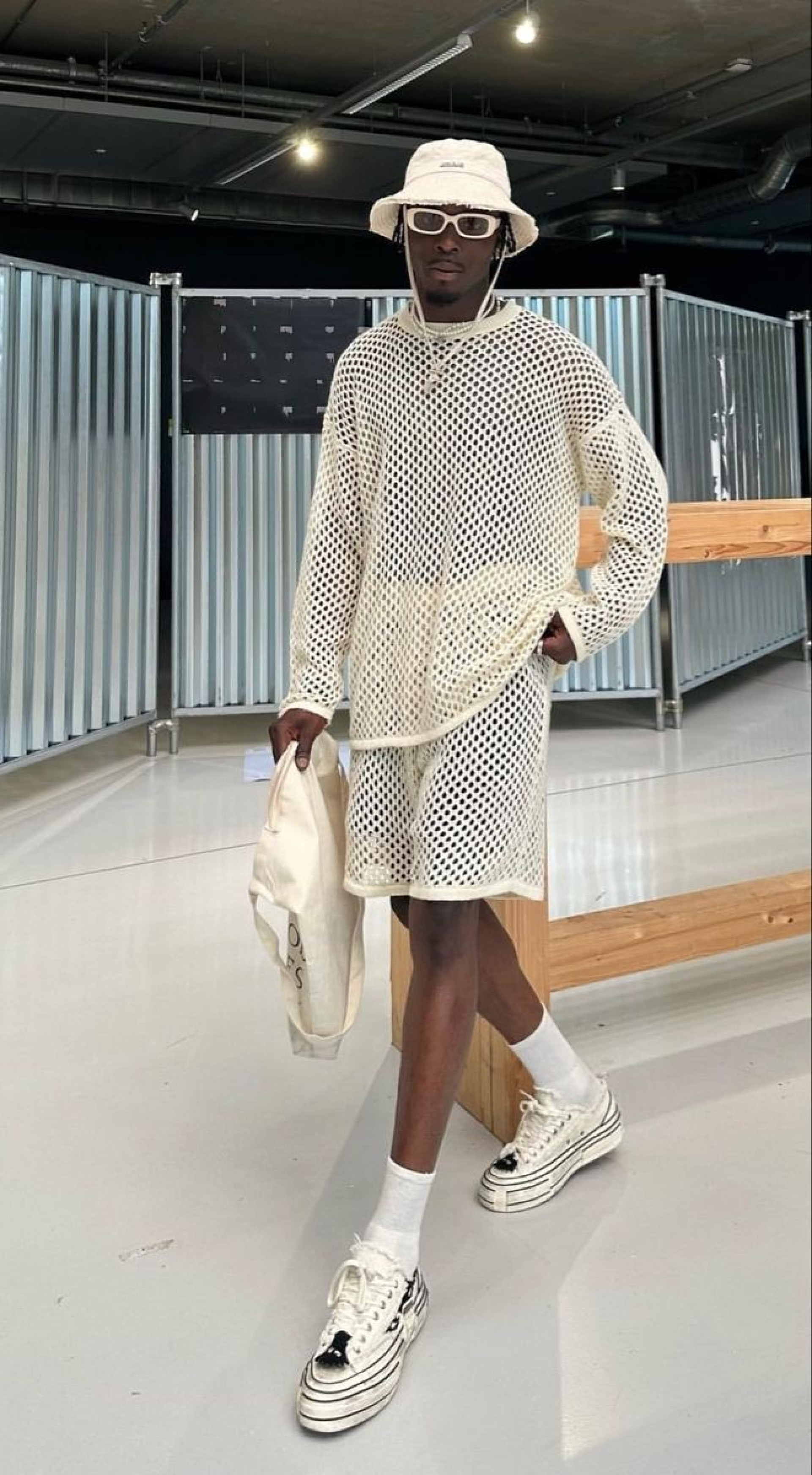 Uma referência interessante foi a camisa de tricô, que está em alta e pode ser uma excelente escolha para festivais, desde que seja feita de material confortável. O tricô, além de ser tendência, traz uma textura diferenciada ao look e costuma ser colorido, o que enriquece o visual.