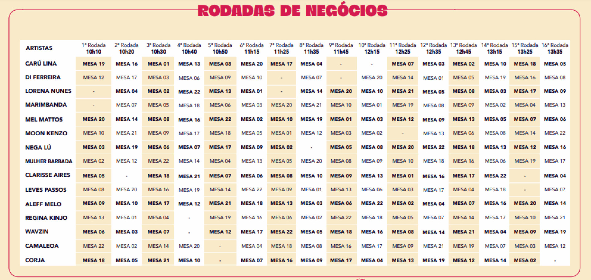Já na sexta-feira, 22, participam da mesa de negócios Mulher Barbada, Clarisse Aires, Leves Passos, Aleff Melo, Regina Kinjo, Wavzin, Camaleoa e Corja.