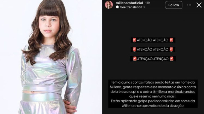 Em um story no Instagram da atriz, a família afirma que pessoas estão aplicando golpes ao pedirem vaquinha em nome de Millena e criando perfis falsos.