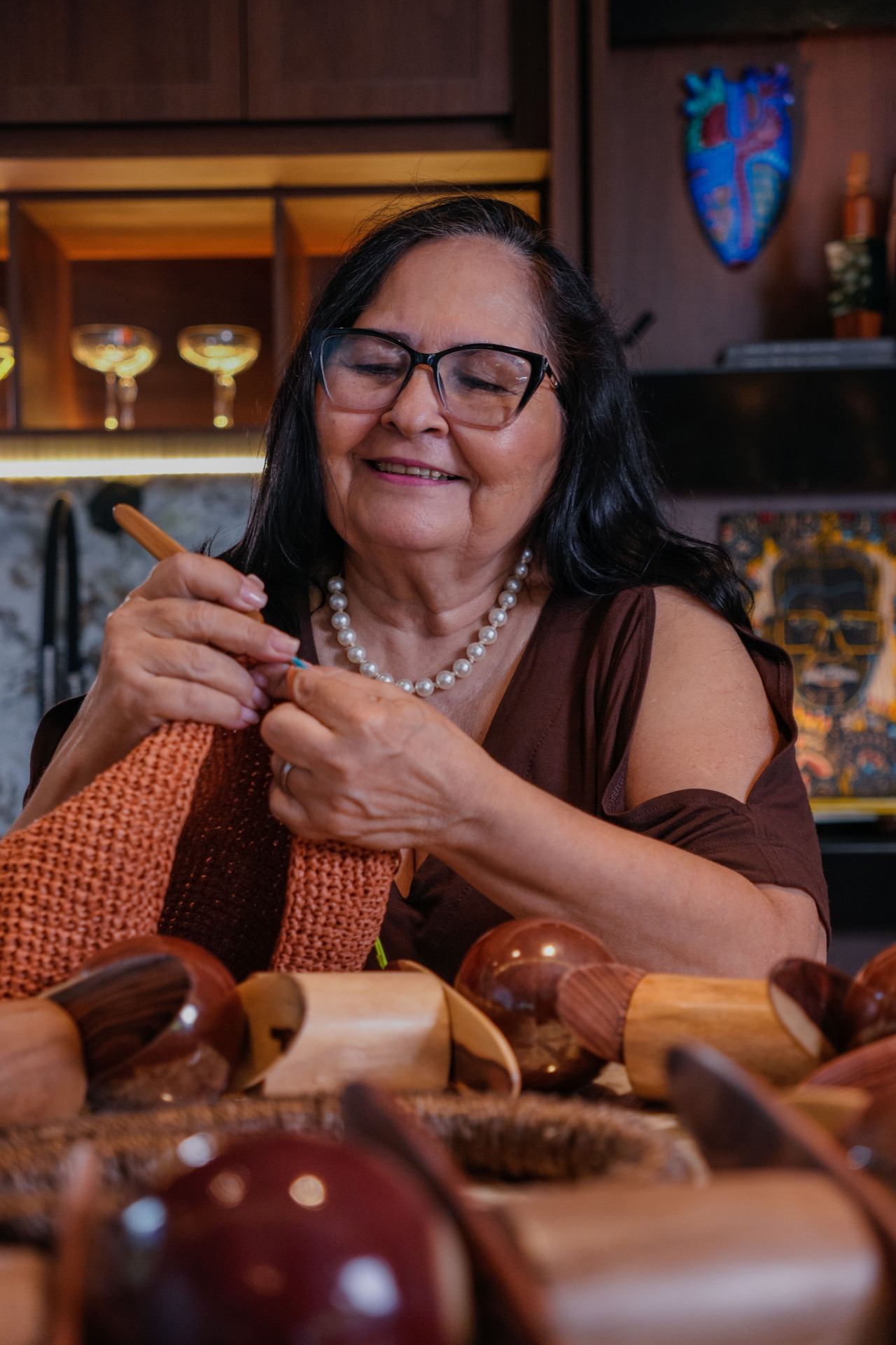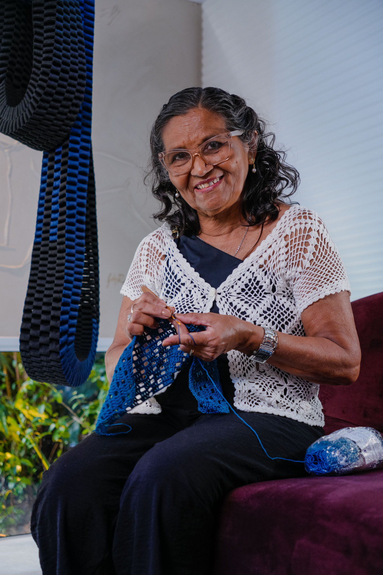“Sempre admirei minha mãe, que me ensinou. O crochê me trouxe orgulho e uma forma de organizar o dia”, explica. Sobre o encontro, disse: “Foi ótimo estar rodeada dessas mulheres, observando suas experiências e técnicas. Me senti motivada a evoluir”.