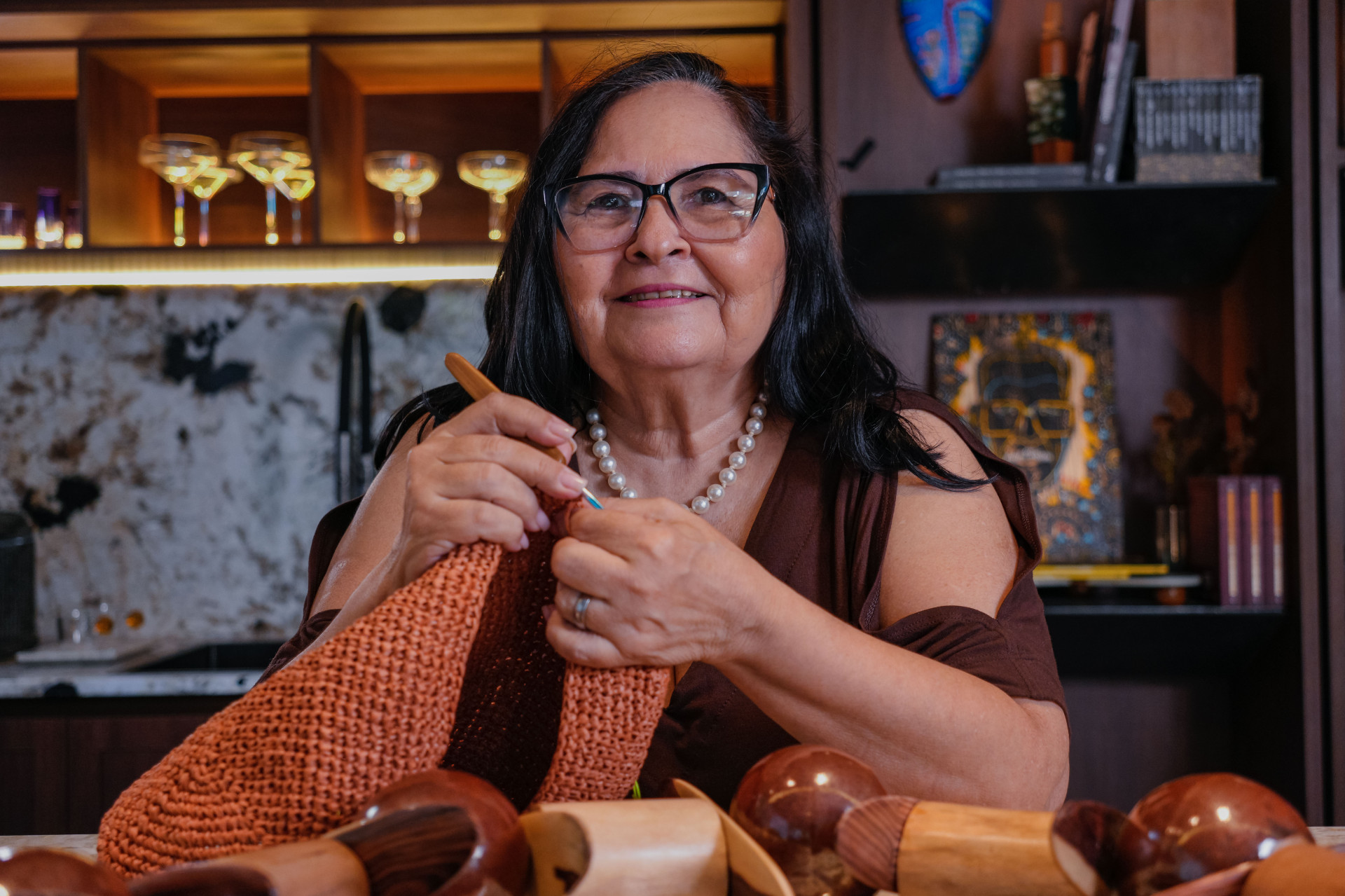 Maria Coelho, 54 anos, ex-analista ambiental que se dedica integralmente ao artesanato, relatou seu início nas práticas aos 12 anos, quando aprendeu crochê com a noiva do primo.