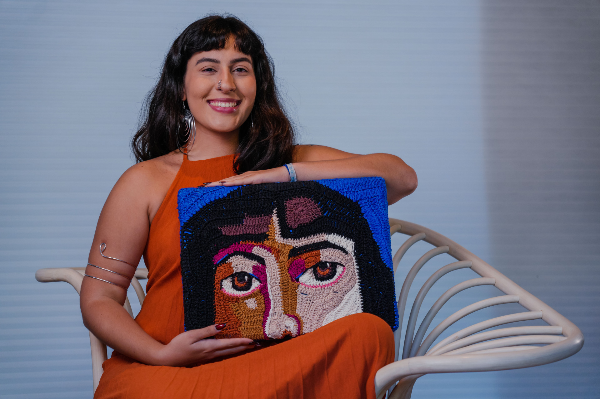 Bia Mourão, 25 anos, artista visual, trouxe o olhar contemporâneo ao grupo. Aprendeu crochê ainda criança em Nova Russas e hoje combina técnica com liberdade criativa em suas obras.