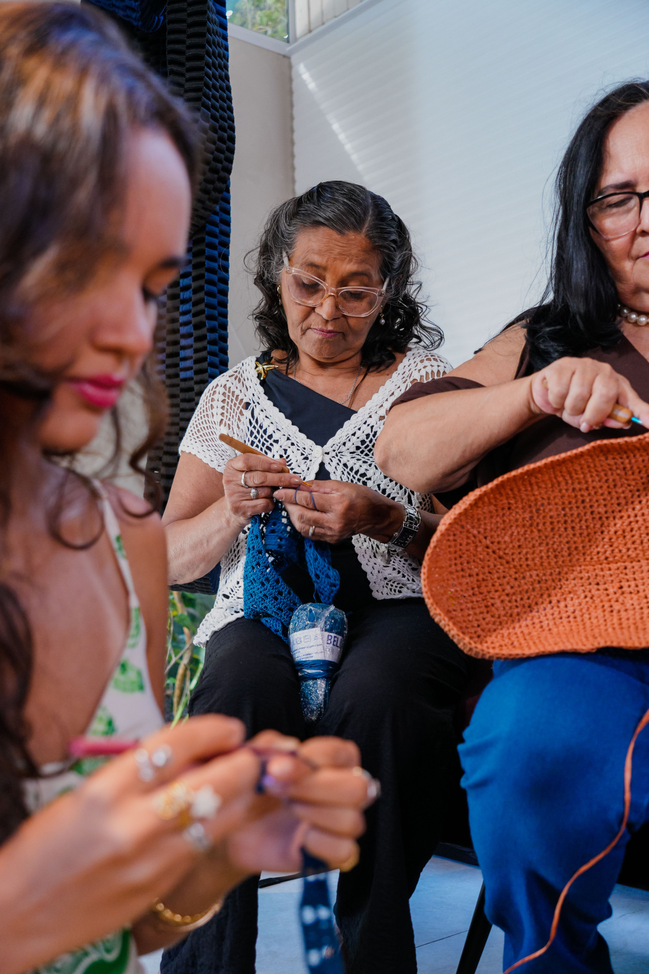 O encontro permitiu observar a troca entre gerações: as mais experientes acolheram as mais novas, compartilhando estratégias, erros e acertos, e explicando sobre fios, texturas e durabilidade das peças.