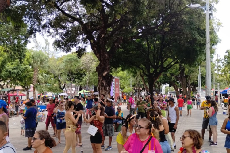 A programação da terça-feira de Carnaval no bairro Benfica começou com o público chegando aos poucos na praça João Gentil. Enquanto a banda Batuque de Mulher inicia as festividades, os foliões vão se aproximando.