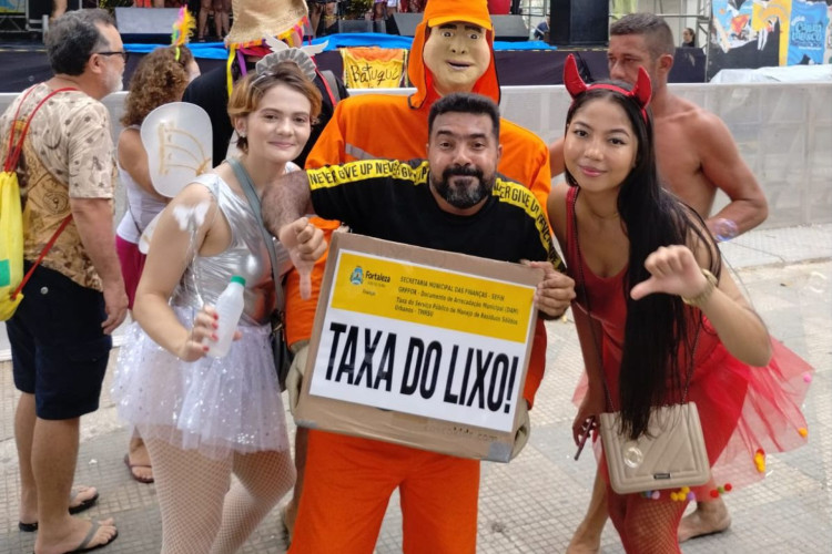 Anderson Ribeiro, brincante há 30 anos confeccionou uma fantasia que critica a Taxa do Lixo, imposto pago na Capital cearense para custear a coleta domiciliar de resíduos sólidos.