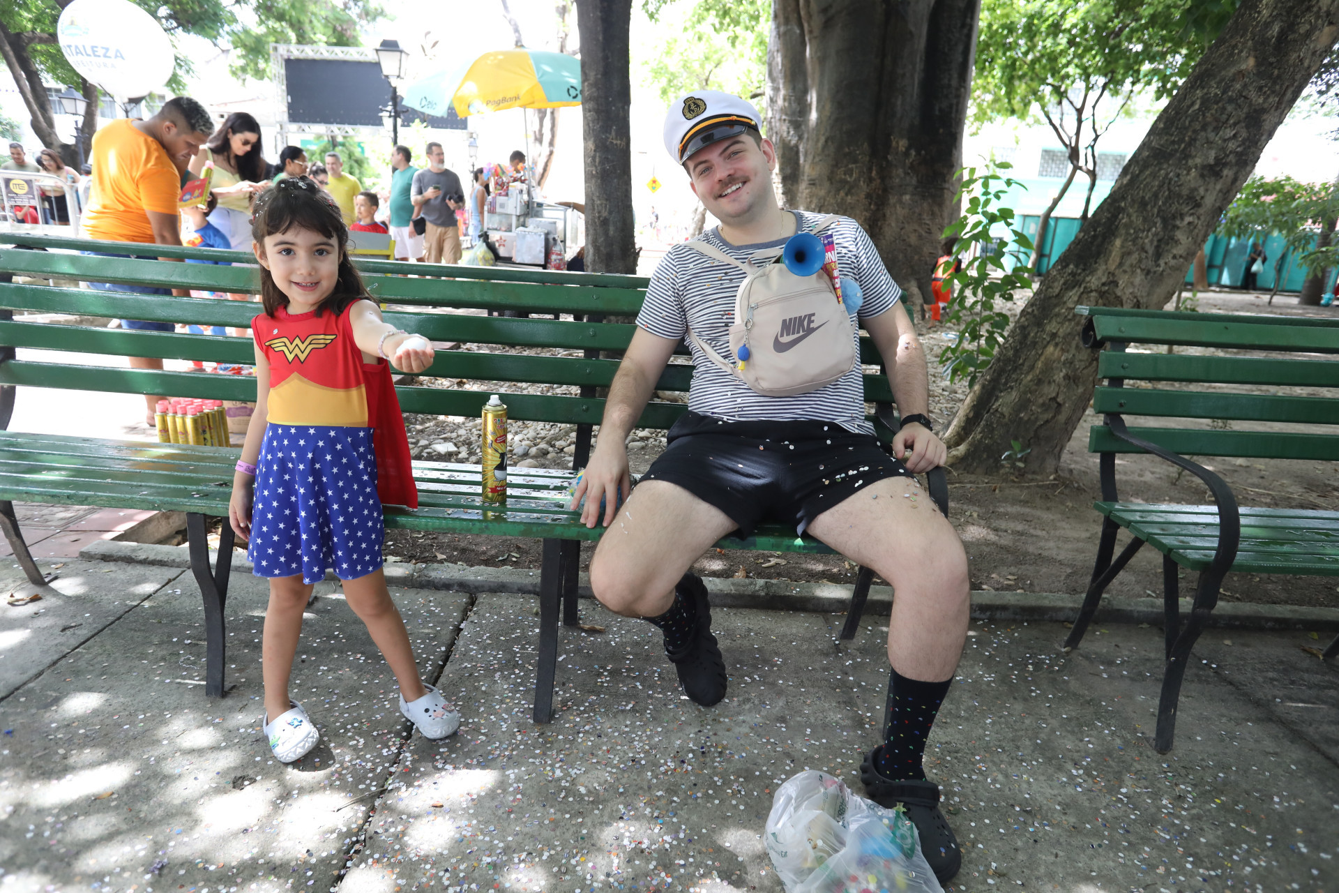 Entre elas estava Maria Eduarda, 4, que esbanjava trajes de um dos seus filmes prediletos, Divertida Mente 2. O pai da pequena, Bruno de Freitas, 35, assistia nos bancos da praça a filha correr em meio ao confete e espuma vistos por todo lado da praça e comemora a existência de um espaço tranquilo para as crianças aproveitarem o Carnaval.