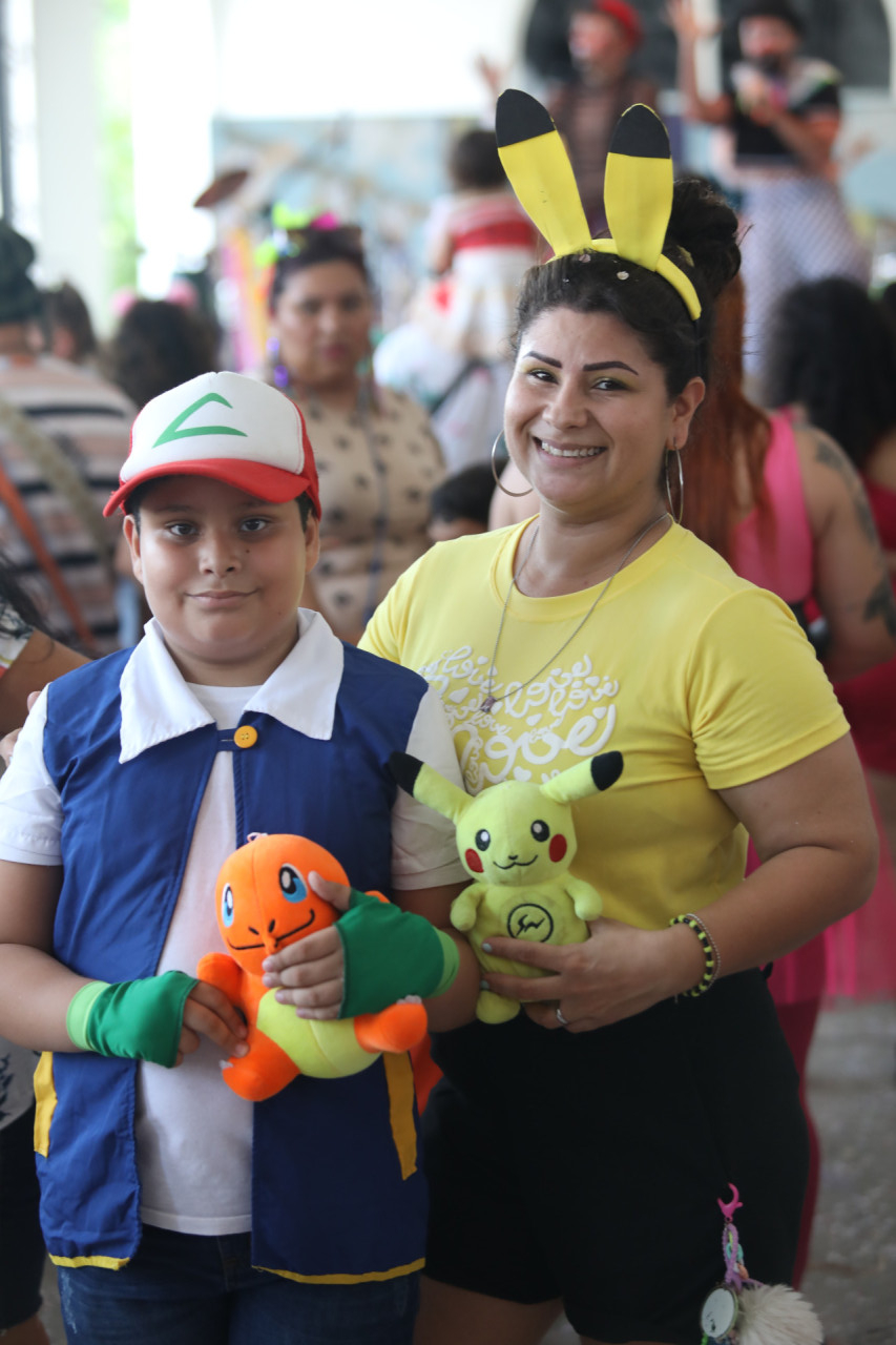 Na folia também houve quem decidiu entrar na brincadeira do filho e sair de fantasias combinadas para curtir as atrações na Estação. Natália Nelly, 36, foi vestida de Pikachu para ser a companhia de seu Brian, mas que naquele momento atendia por Ash Ketchum, protagonista do anime Pokémon.