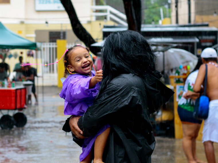 Sombrinhas e capas também preencheram o espaço daqueles mais desmotivados pelo clima de edredom. Na Praça da Gentilândia, nem mesmo um temporal impediria o bombeiro militar Arthur França, 37, de finalmente pular Carnaval com a família.