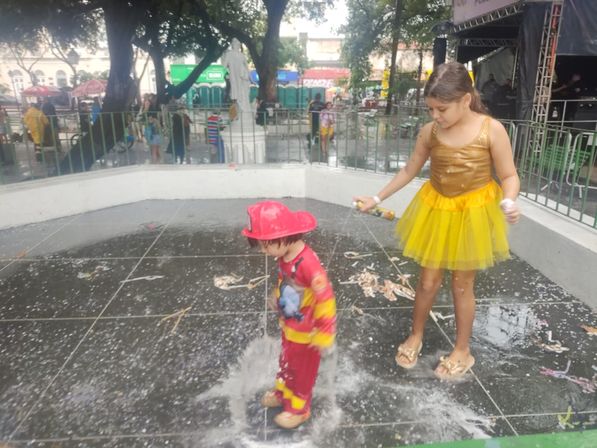 A professora Kelliane Mourão já havia vivido a festa na Praça dos Mártires no ano anterior. Desta vez, foi surpreendida pela chuva iniciada por volta das 9h30min. Ainda assim, os pequenos Miguel, filho de 2 anos, e Ester, sobrinha de 10, continuaram aproveitando “um mela-mela improvisado”. “Infelizmente, hoje choveu muito forte e eles ainda estão curtindo”, contou.