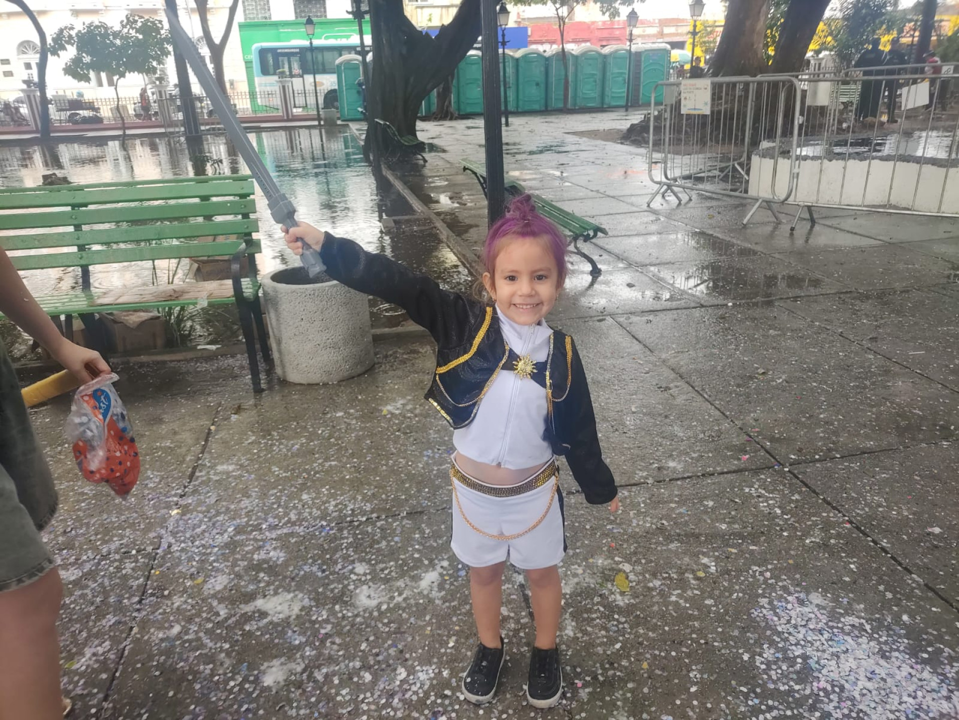 Entre serpentinas molhadas e pingos persistentes, personagens clássicos do Carnaval continuaram circulando pela praça. Princesas, super-heróis e fadas dividiram espaço com fantasias inovadoras, como a da pequena Alice Teles, de 4 anos, vestida como Rumi, personagem do filme de animação “Guerreiras do K-Pop”.