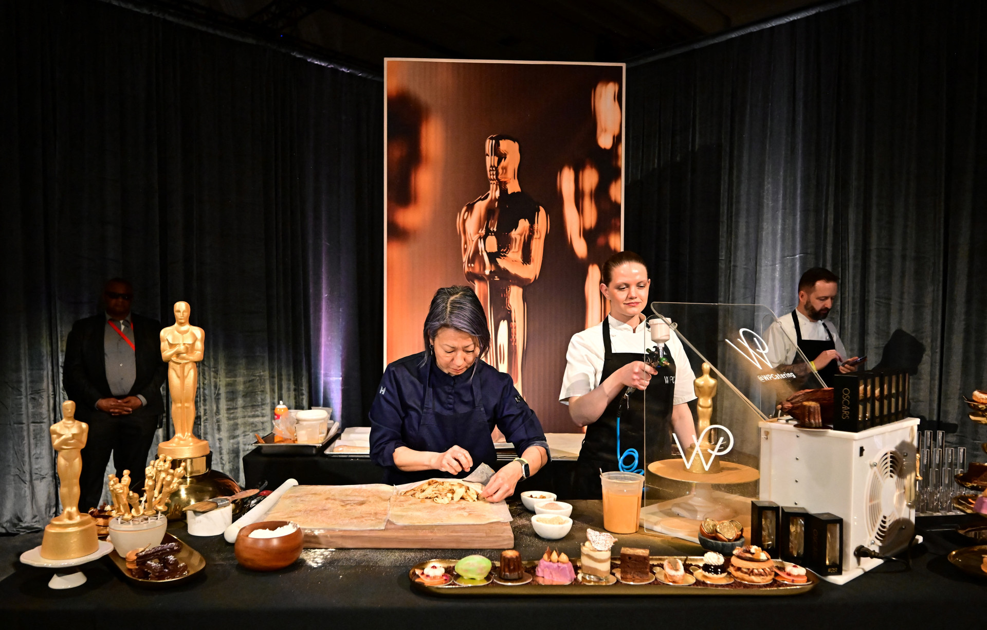 O chef Garry Larduinat, da equipe de Puck, vai servir mais de 30 tipos de sobremesa, incluindo strudel de maçã e charutos de chocolate. Também vão circular as tradicionais estatuetas de chocolate banhadas em pó dourado. (Por Paula Ramon / AFP)